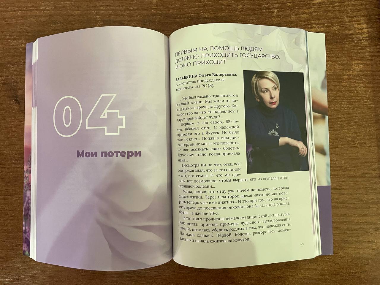 «Я действительно являюсь соавтором этой книги. Мои родители ушли из жизни от рака. После их смерти я называю себя ребёнком-сиротой, но это дало мне силы идти дальше. Издание уникальное, всех авторов объединяет жизненное испытание, которое связано с онкологией», — поделилась заместитель председателя правительства Якутии Ольга Балабкина.