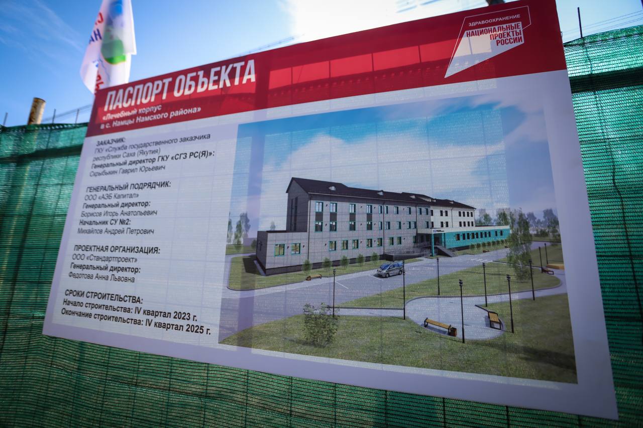 Айсен Николаев отметил, что новое трёхэтажное здание нового лечебного корпуса Намской ЦРБ будет возводиться по национальному проекту «Здравоохранение», реализуемому по поручению Президента России Владимира Путина.