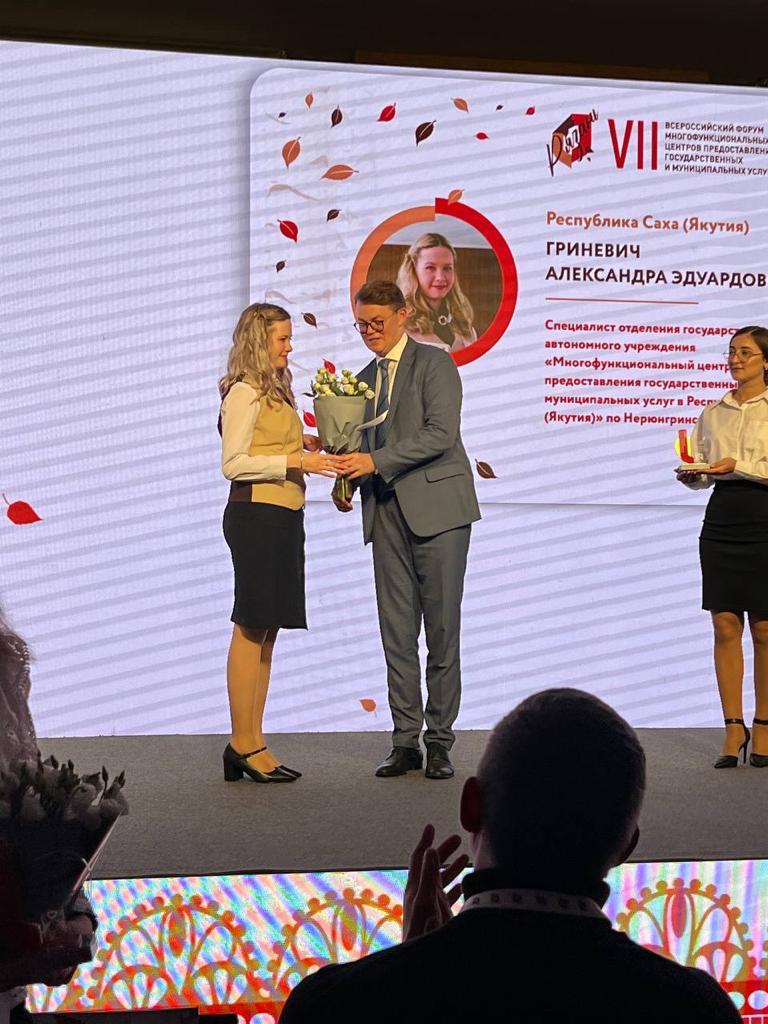 Александра лично посетила форум в составе делегации якутского МФЦ и получила заветный трофей из рук статс-секретаря – заместителя министра экономического развития РФ Алексея Херсонцева.