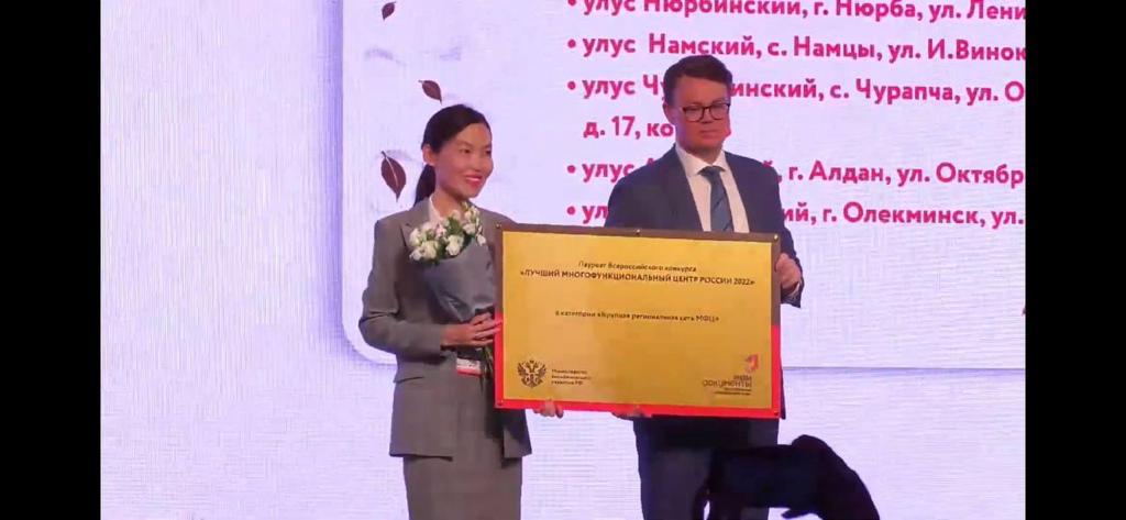 Награда была вручена руководителю ГАУ «МФЦ РС (Я)» Таисии Никитиной, которая прибыла в Рязанскую область в составе якутской делегации. Ранее, 5-го октября, Таисия Львовна выступила в качестве спикера региональной сессии VII Всероссийского форума многофункциональных центров на тему «Скачок через обучение: развитие лучших качеств сотрудника МФЦ».