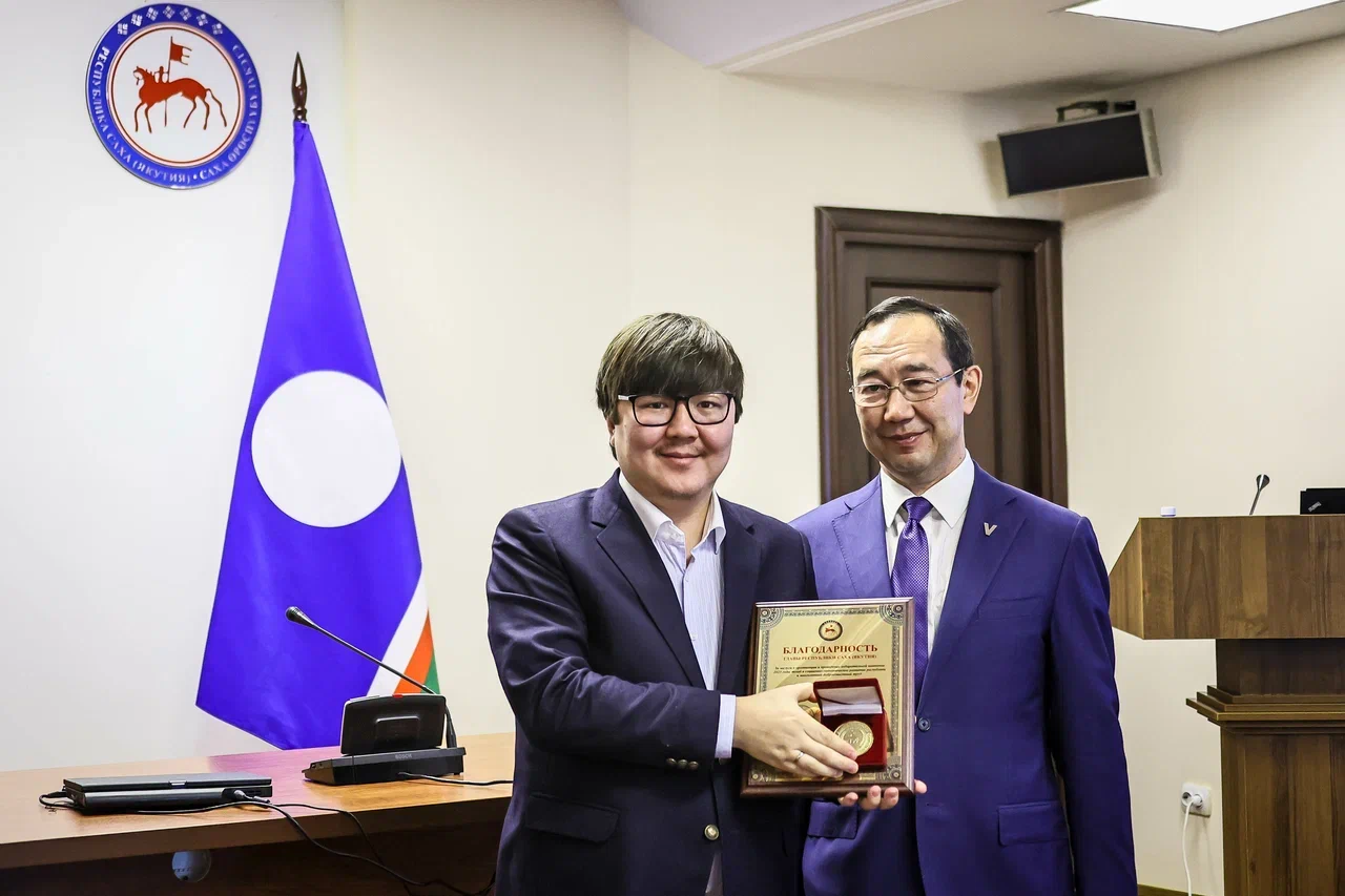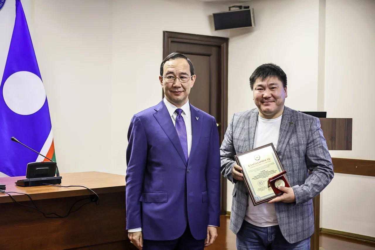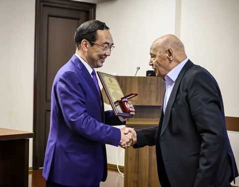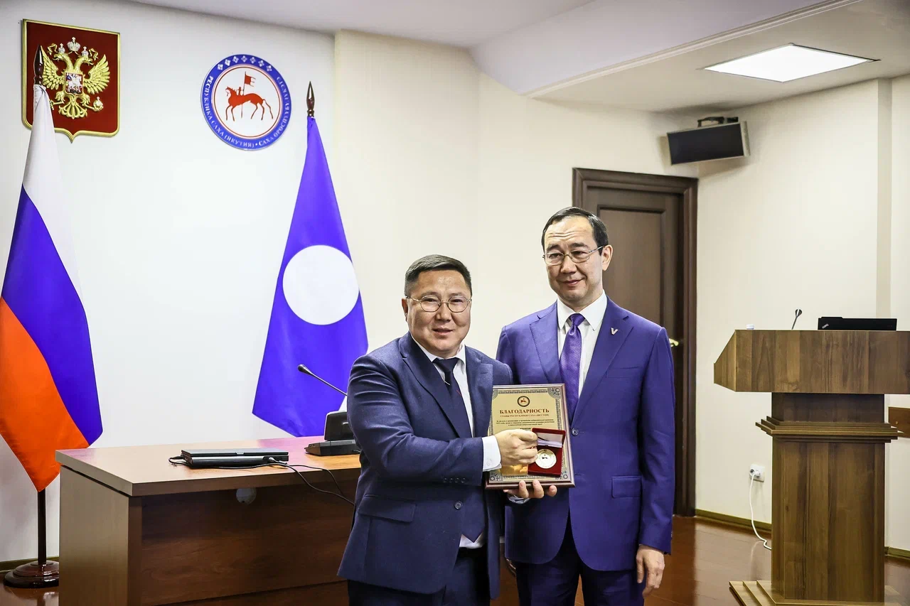 Айсена Николаева с избранием вновь на должность главы республики поздравил заместитель председателя Высшего совета старейшин (Ытык Субэ) республики, почетный гражданин города Якутска Юрий Коркин.