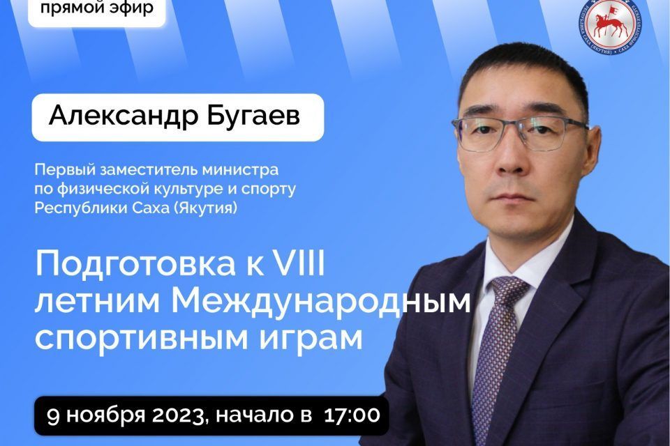 В четверг, 9 ноября, первый заместитель министра по физической культуре и спорту Якутии Александр Бугаев проведет прямой эфир в соцсетях.