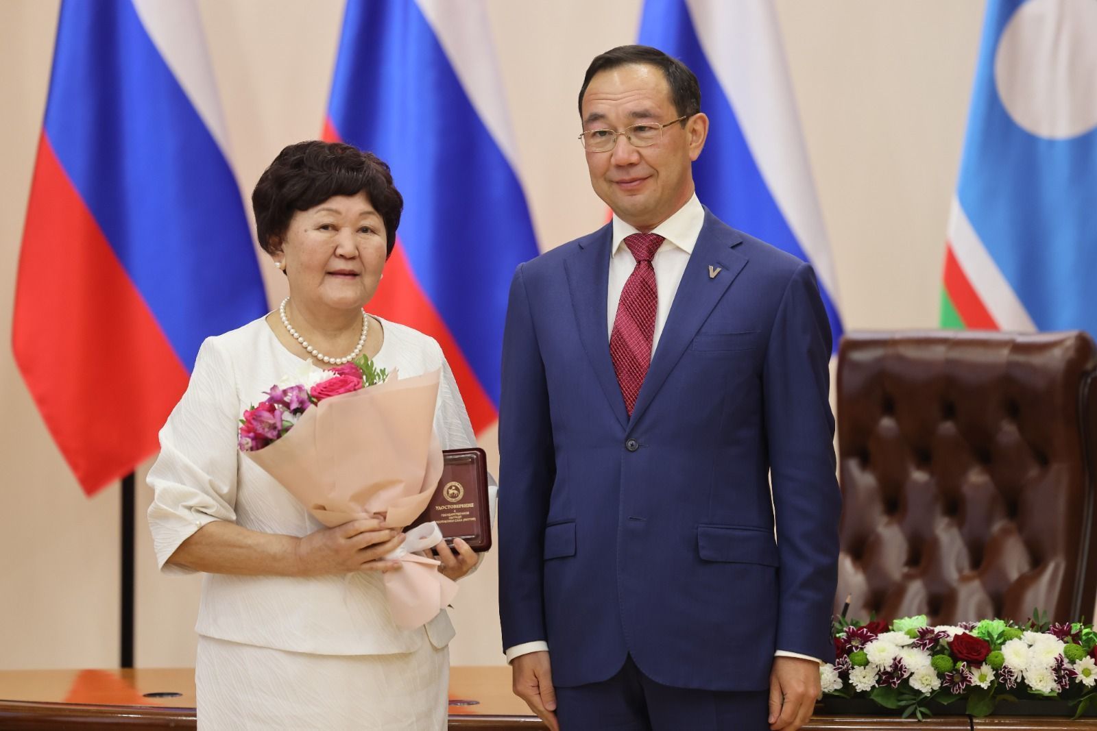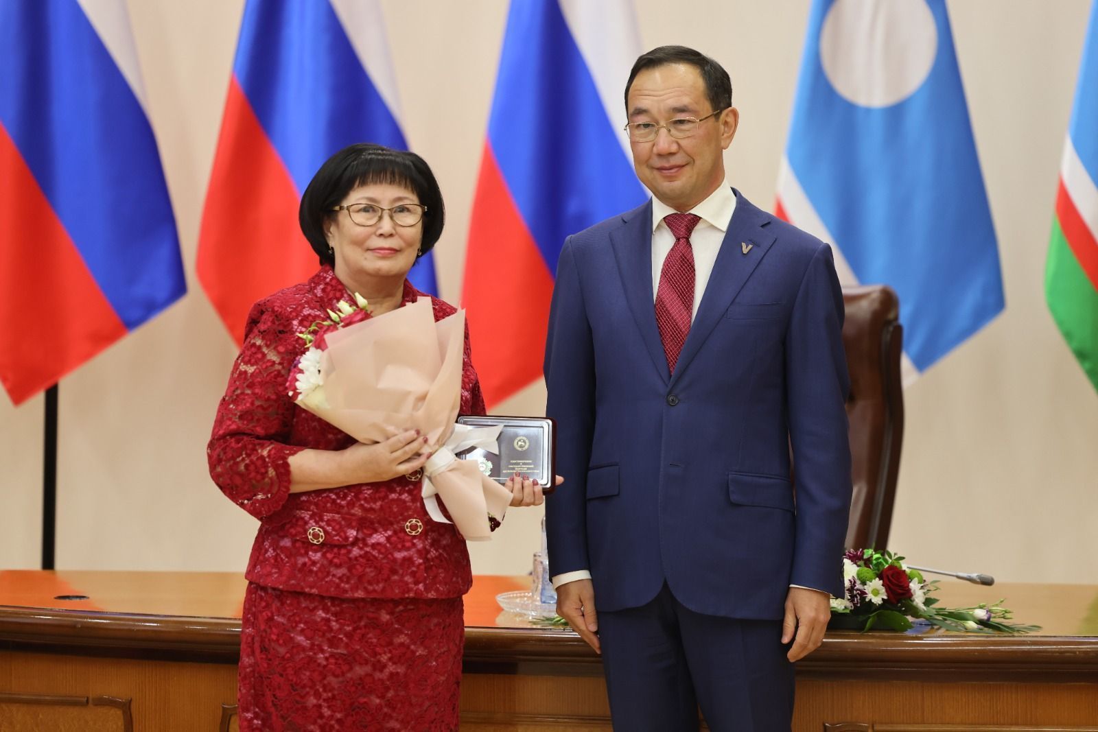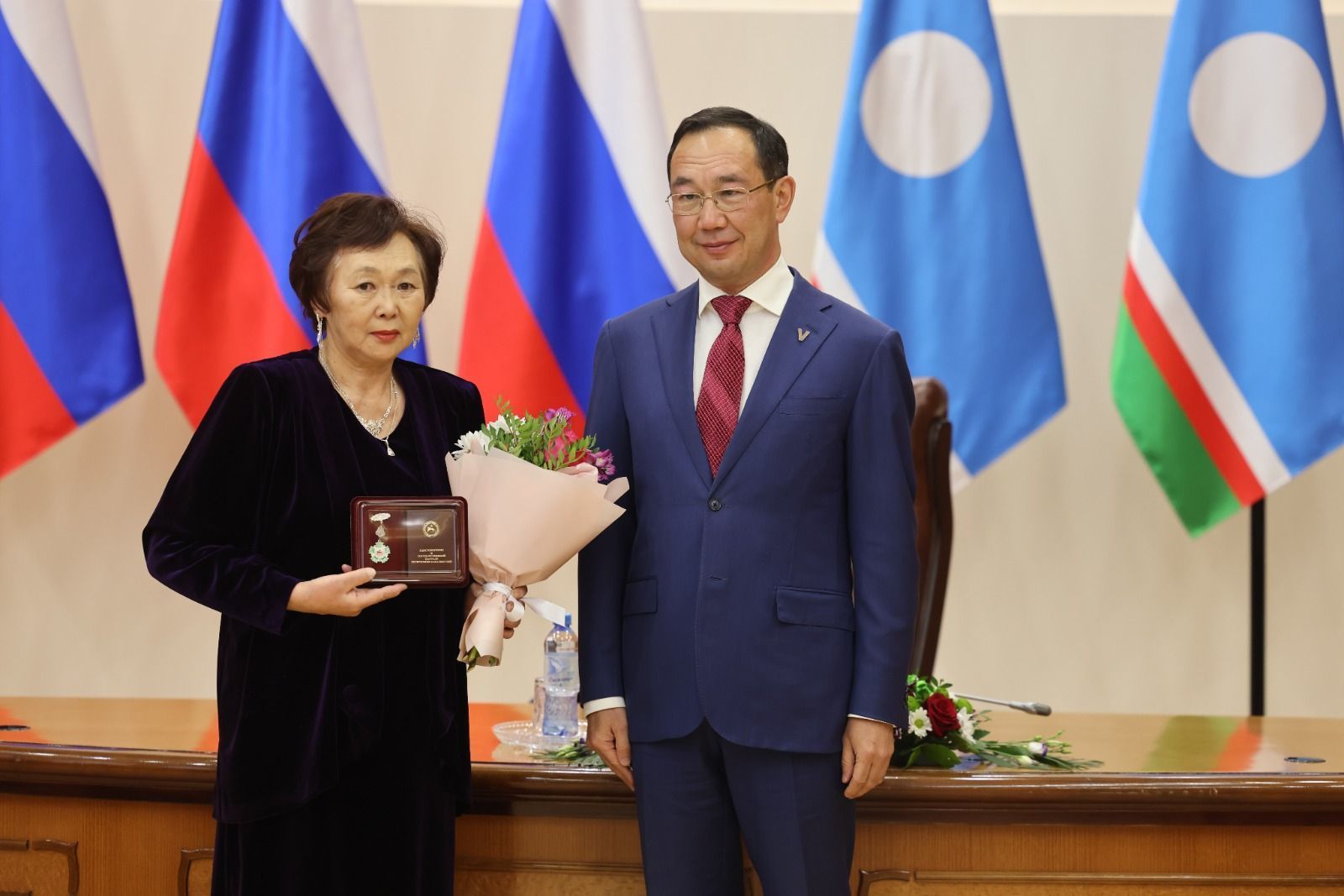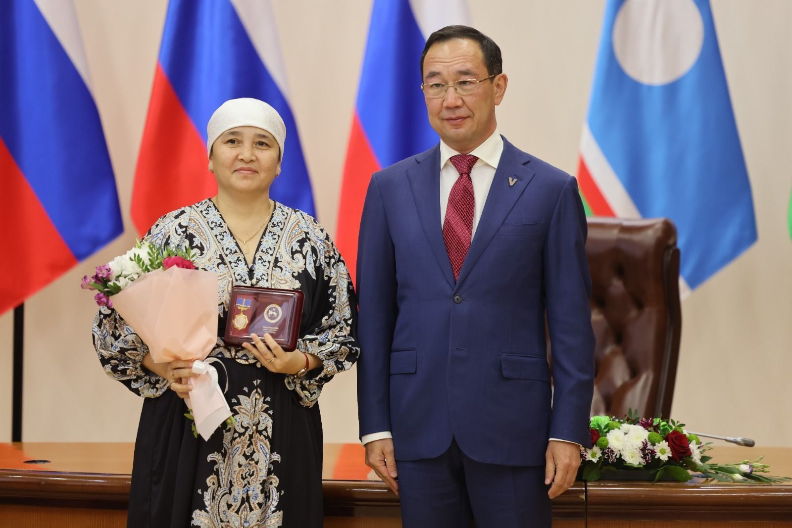 Айсен Николаев вручил Знак высшей благодарности Матери ветерану педагогического труда, почетному работнику общего образования Российской Федерации Феодосии Колесовой из Чурапчинского улуса. Знаками «Мать-героиня» награждены многодетные матери: Любовь Иванова из Якутска, родившая и воспитавшая 11 детей, мамы 10 детей Анастасия Рудых из села Саскылах Анабарского национального (долгано-эвенкийского) улуса и Чынара Тешебаева из Якутска.