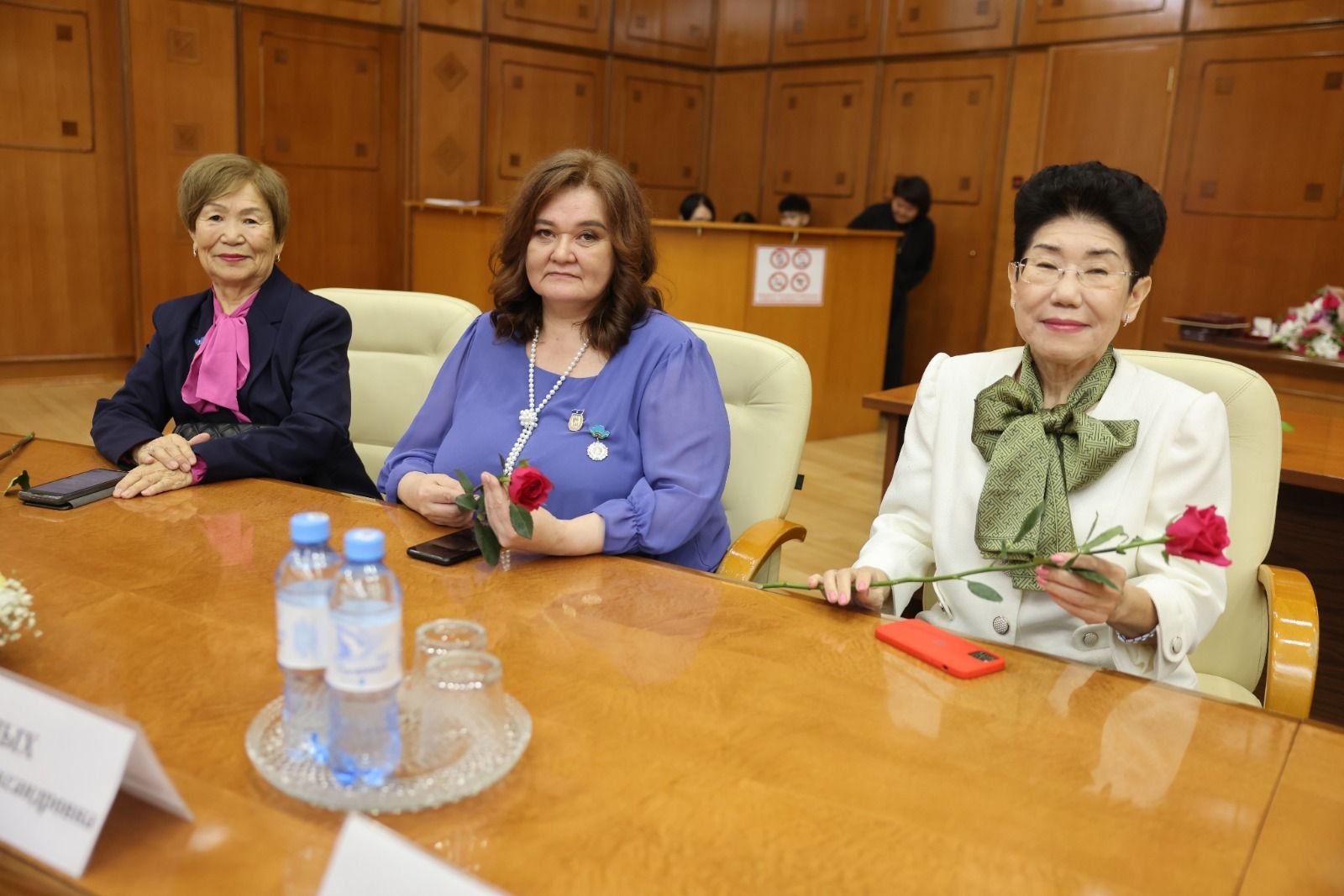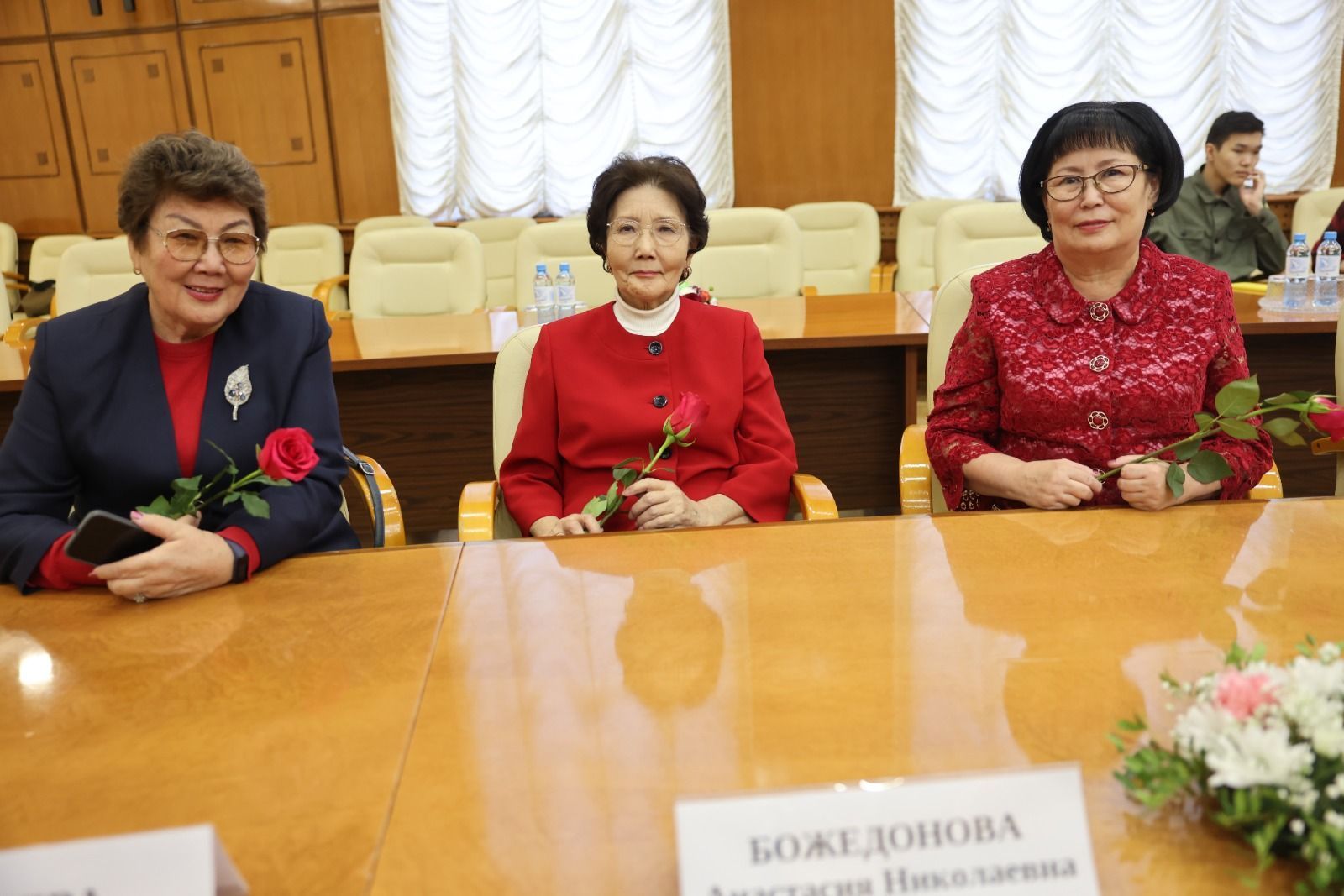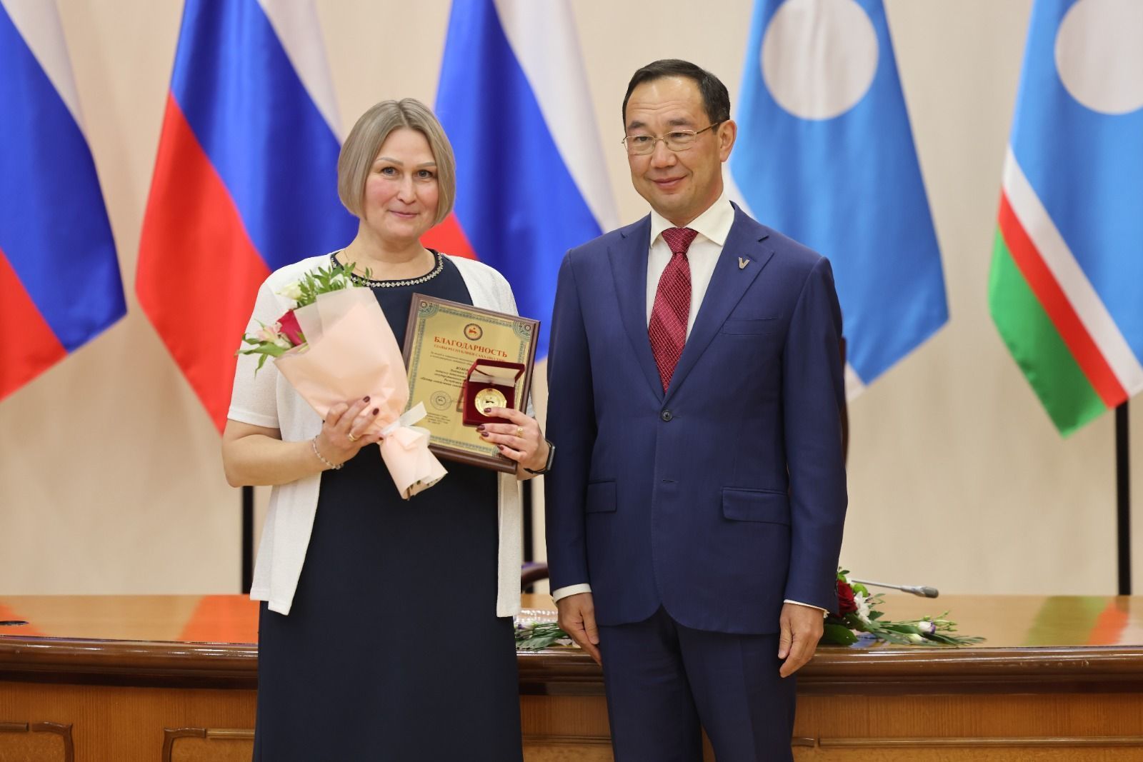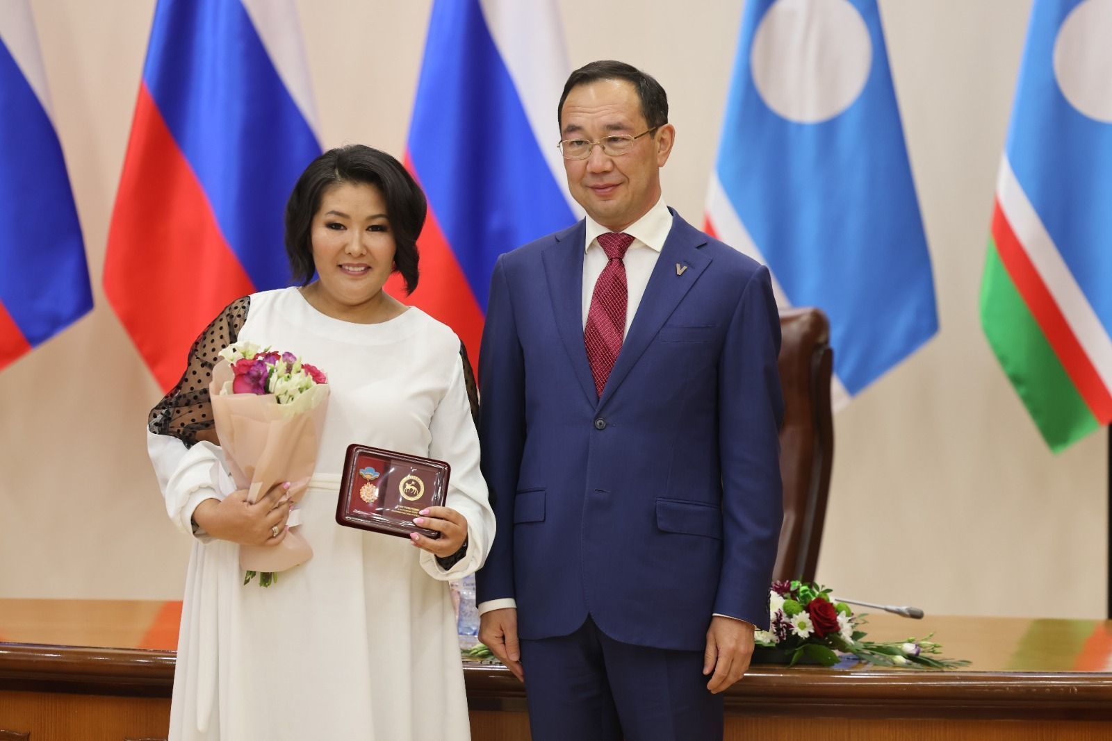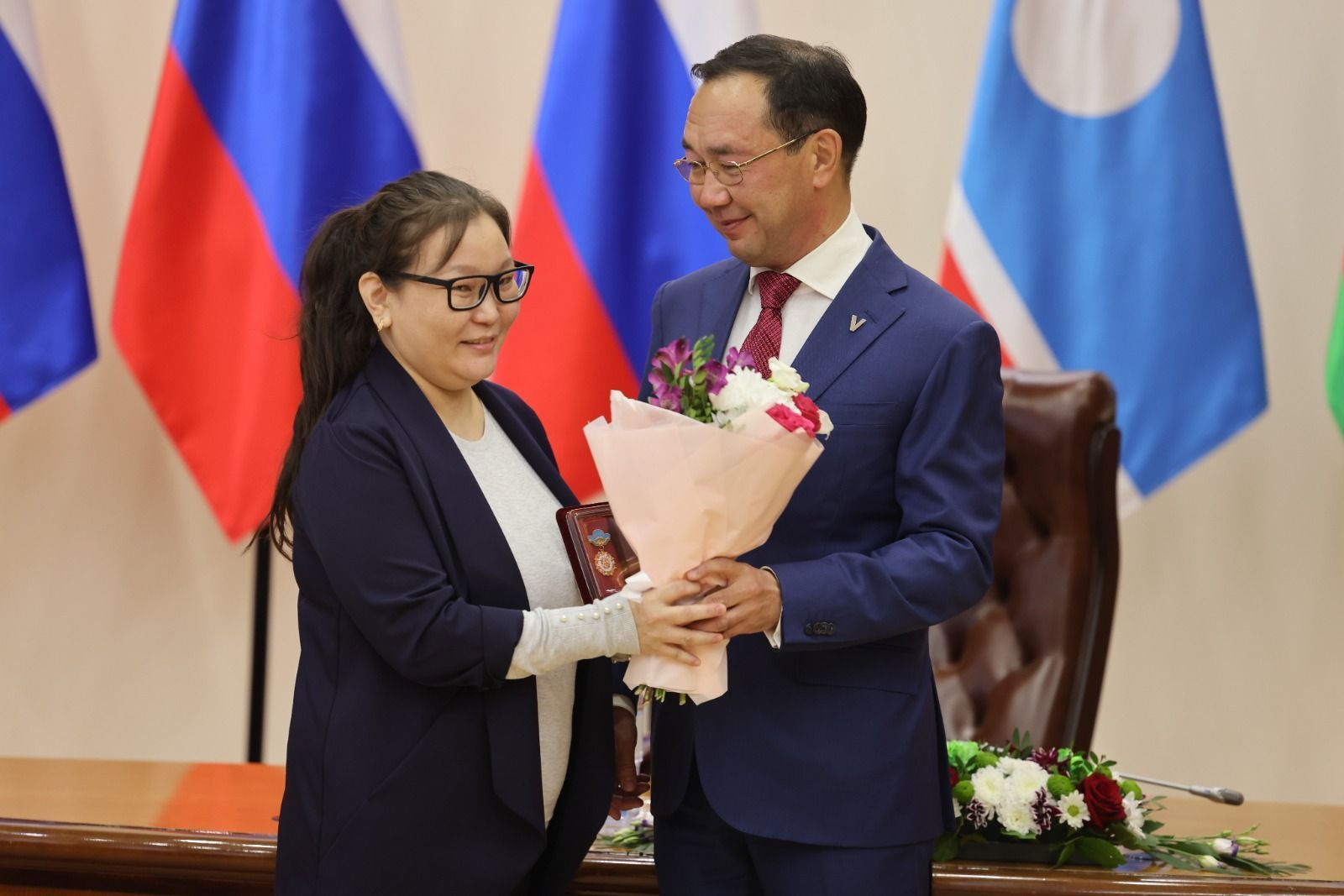 Айсен Николаев вручил Знак высшей благодарности Матери ветерану педагогического труда, почетному работнику общего образования Российской Федерации Феодосии Колесовой из Чурапчинского улуса. Знаками «Мать-героиня» награждены многодетные матери: Любовь Иванова из Якутска, родившая и воспитавшая 11 детей, мамы 10 детей Анастасия Рудых из села Саскылах Анабарского национального (долгано-эвенкийского) улуса и Чынара Тешебаева из Якутска.