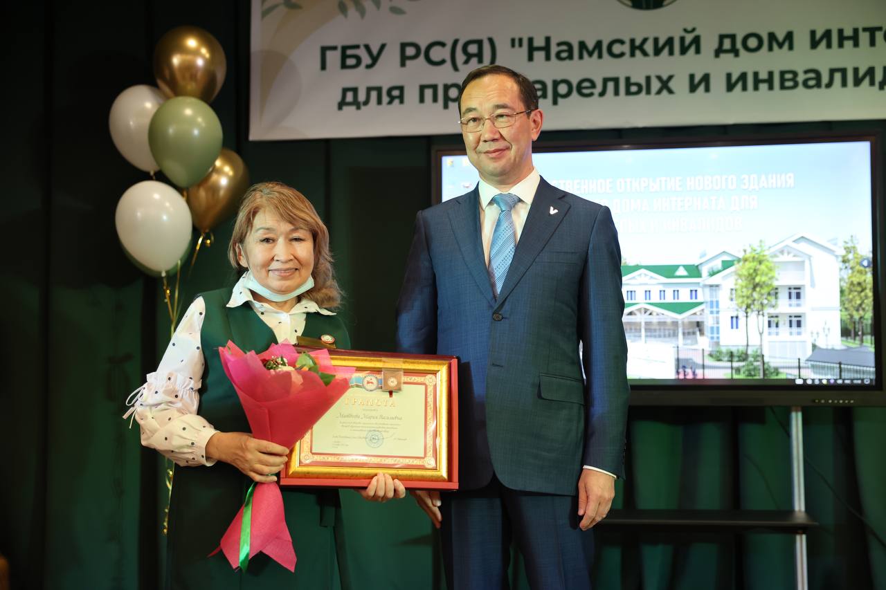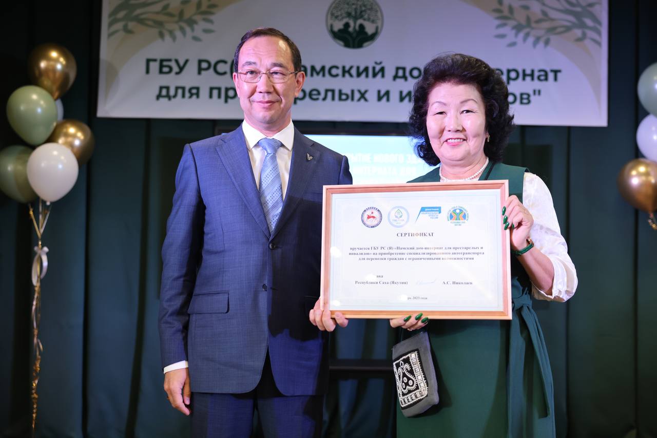 «Я очень рад, что наше старшее поколение и люди с ограниченными возможностями будут жить в уюте, комфорте и безопасности. С 2018 года по инициативе нашего Президента Владимира Владимировича Путина реализуются национальные проекты, в том числе нацпроект «Демография», в рамках которого по программе «Старшее поколение» в республике за последние пять лет введены современные объекты социального обслуживания: здания Вилюйского дома-интерната в селе Сосновка, Дома-интерната престарелых и инвалидов в Олекминске. Сегодня мы вместе открываем новую страницу в истории Намского дома-интерната. В здании площадью почти 5 тысяч кв. метров с удобными спальными комнатами, медицинским и реабилитационным кабинами, помещениями для культурных мероприятий и досуга, столовой и хозяйственными помещениями созданы комфортные условия для проживания нашего старшего поколения и для работы персонала», – сказал Глава Якутии Айсен Николаев и подарил дому-интернату новый специальный автотранспорт.