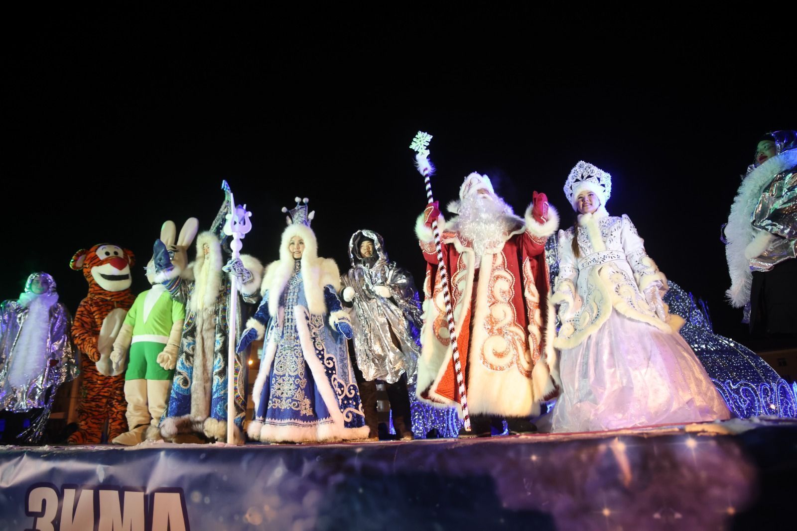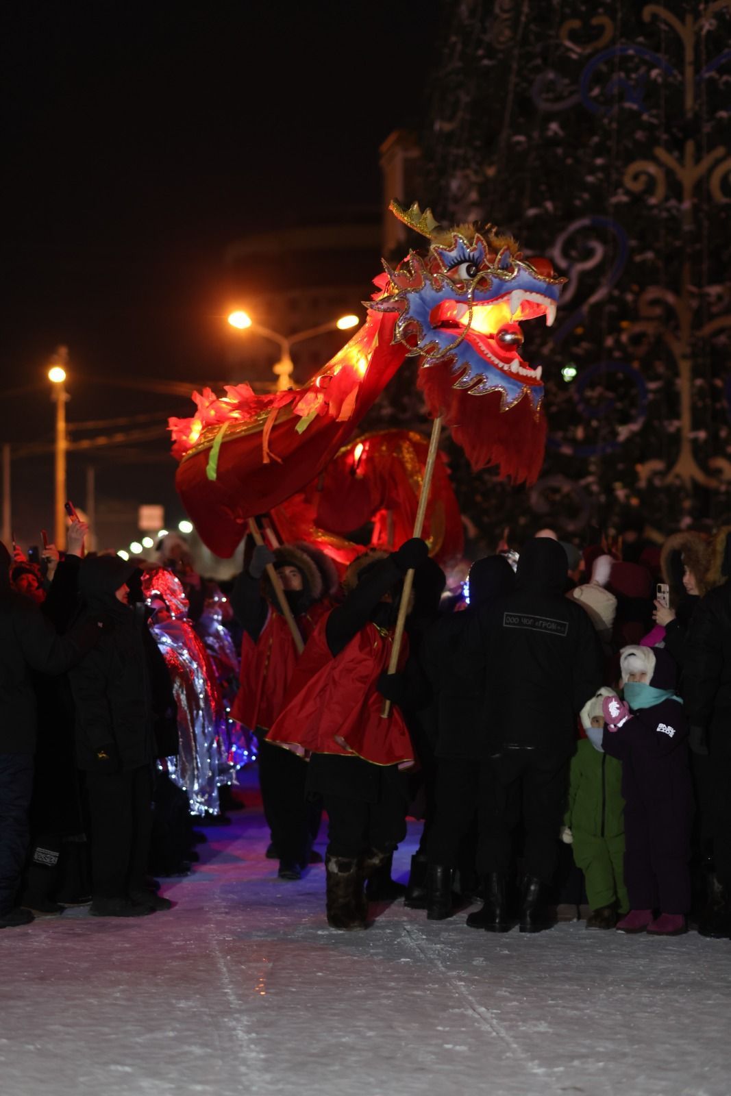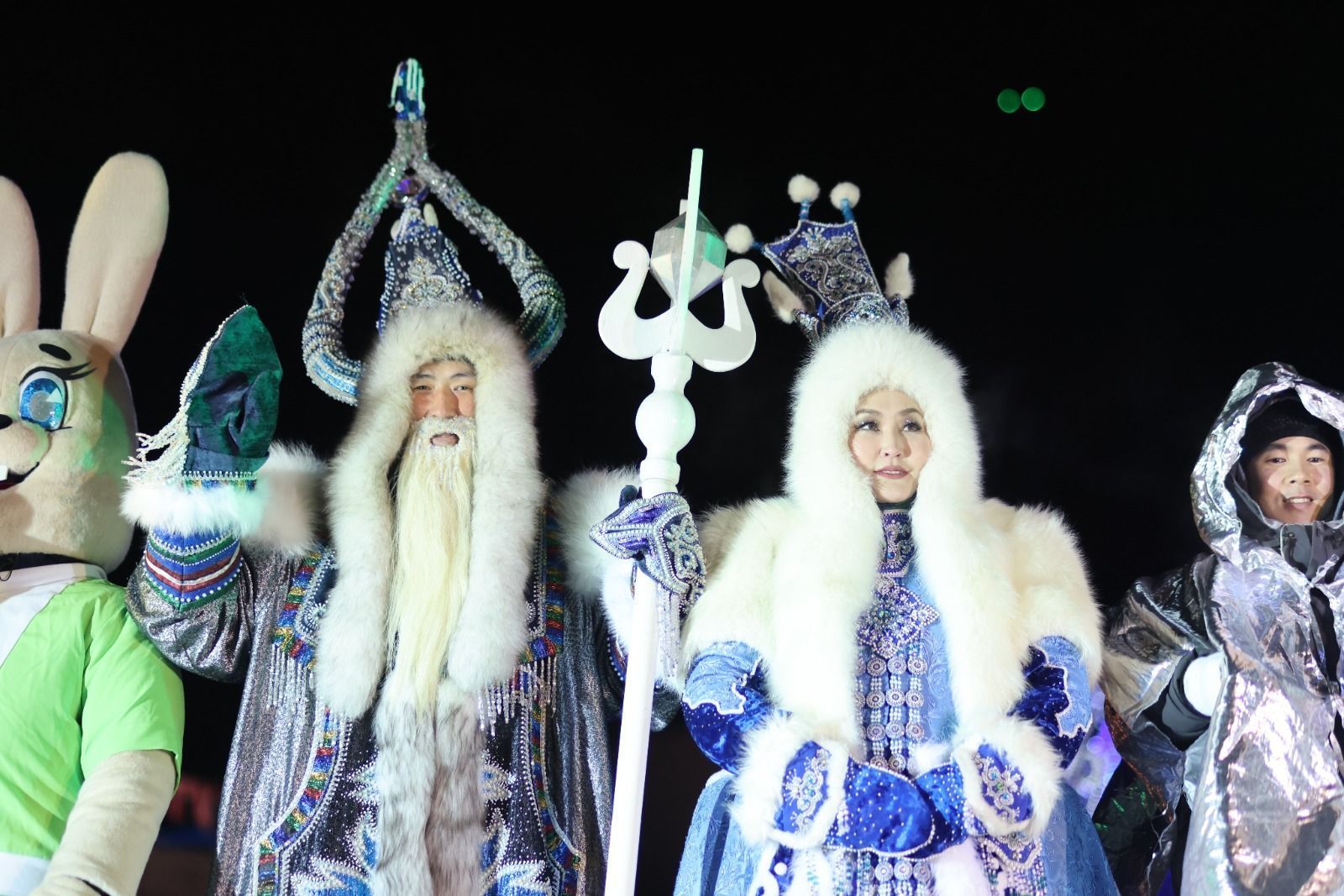 С наступающим Новым годом якутян поздравили мэр Якутска Евгений Григорьев, повелитель холода Чысхаан, якутская Зима, Дед Мороз, Снегурочка и символ 2024 года Дракон.