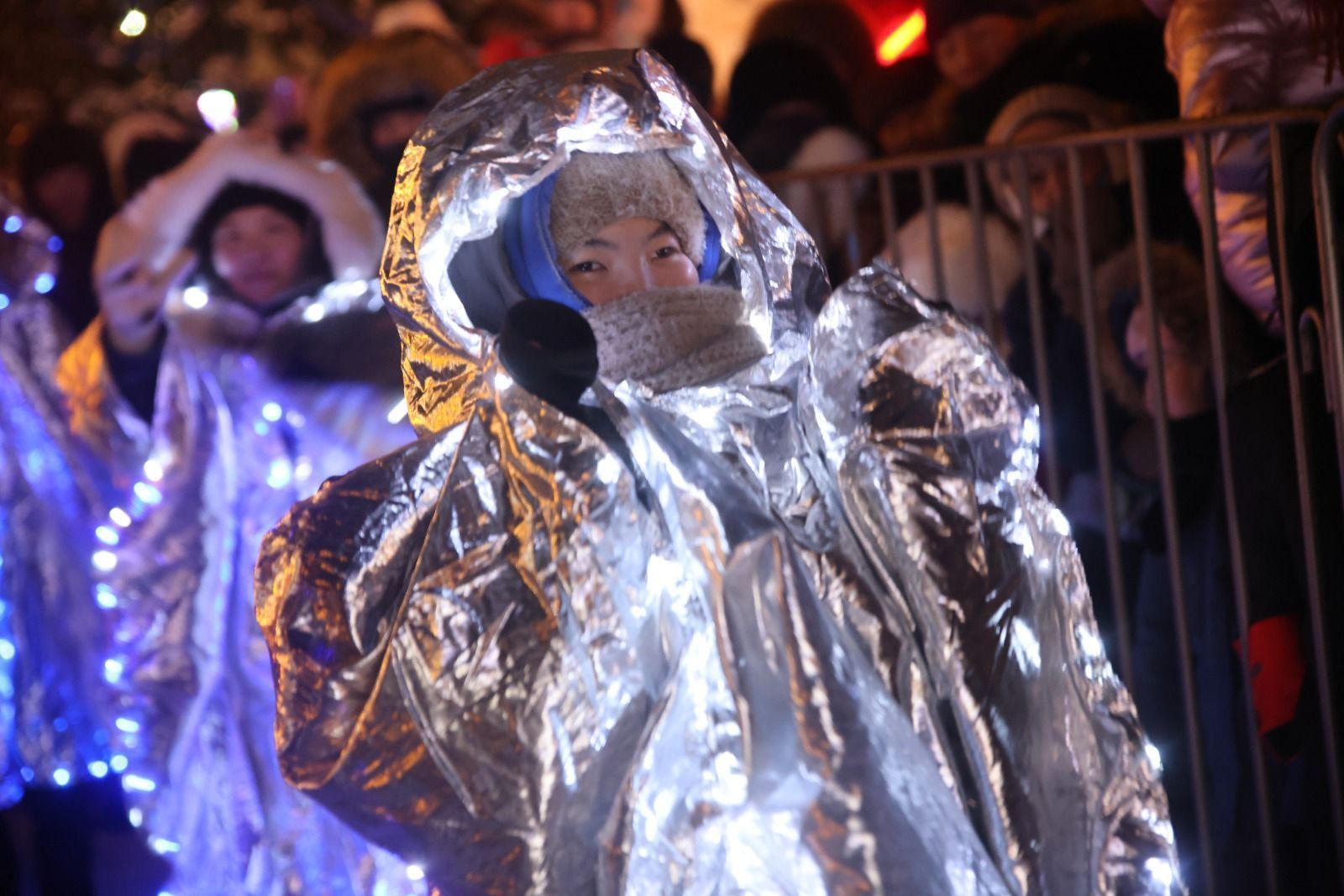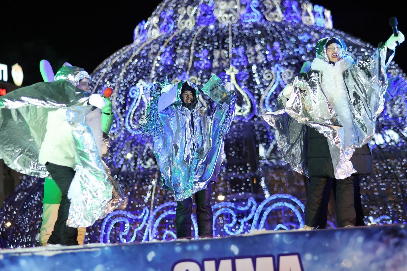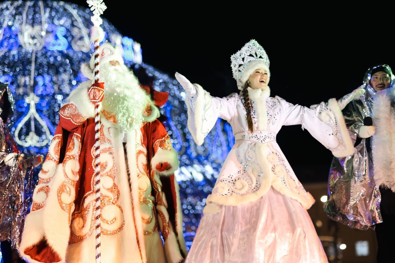 С наступающим Новым годом якутян поздравили мэр Якутска Евгений Григорьев, повелитель холода Чысхаан, якутская Зима, Дед Мороз, Снегурочка и символ 2024 года Дракон.