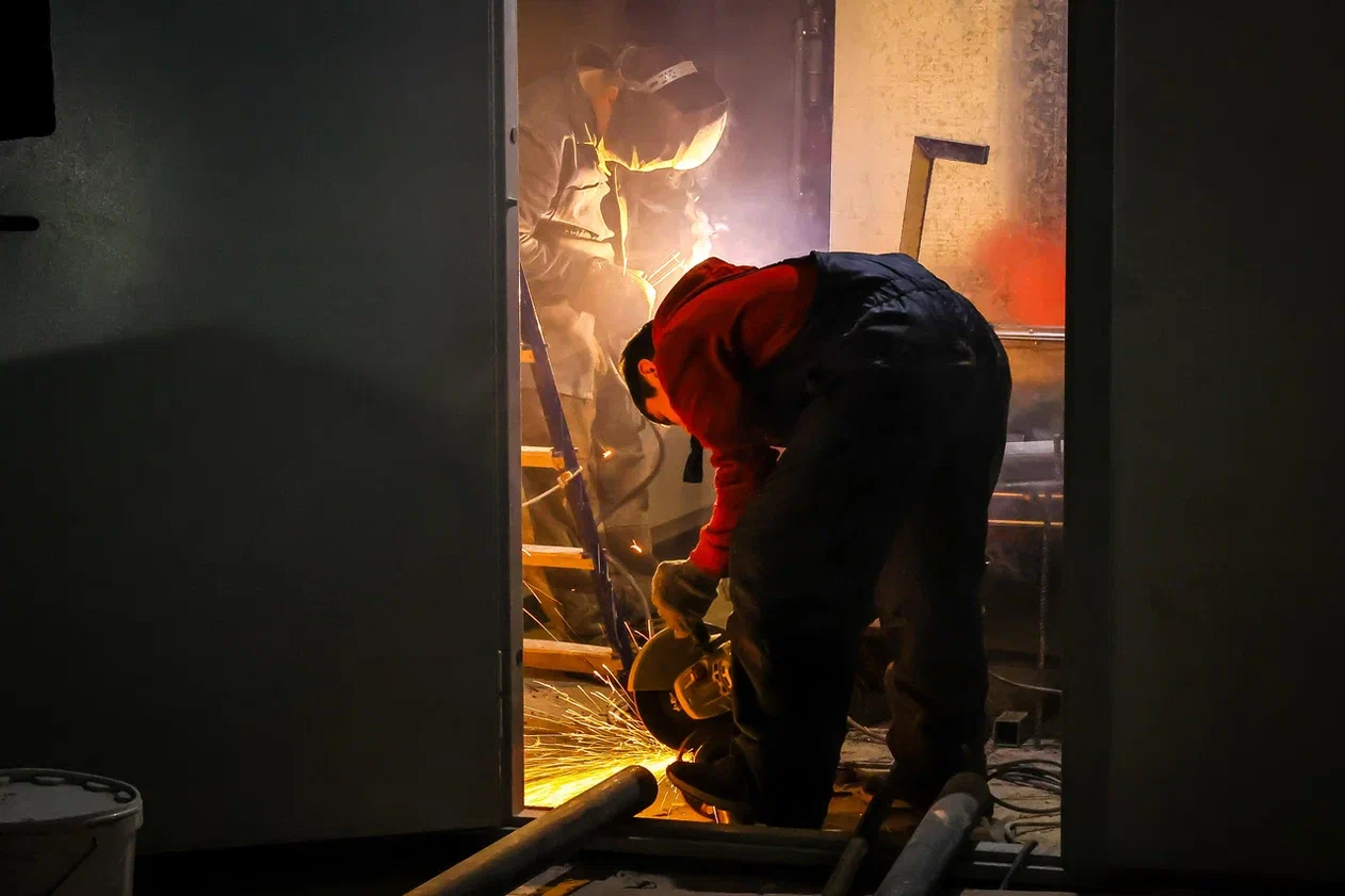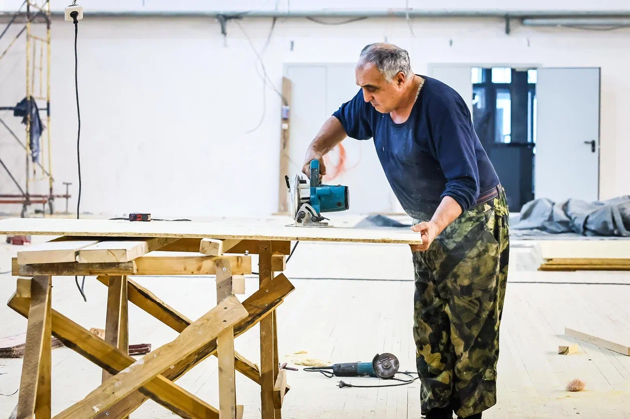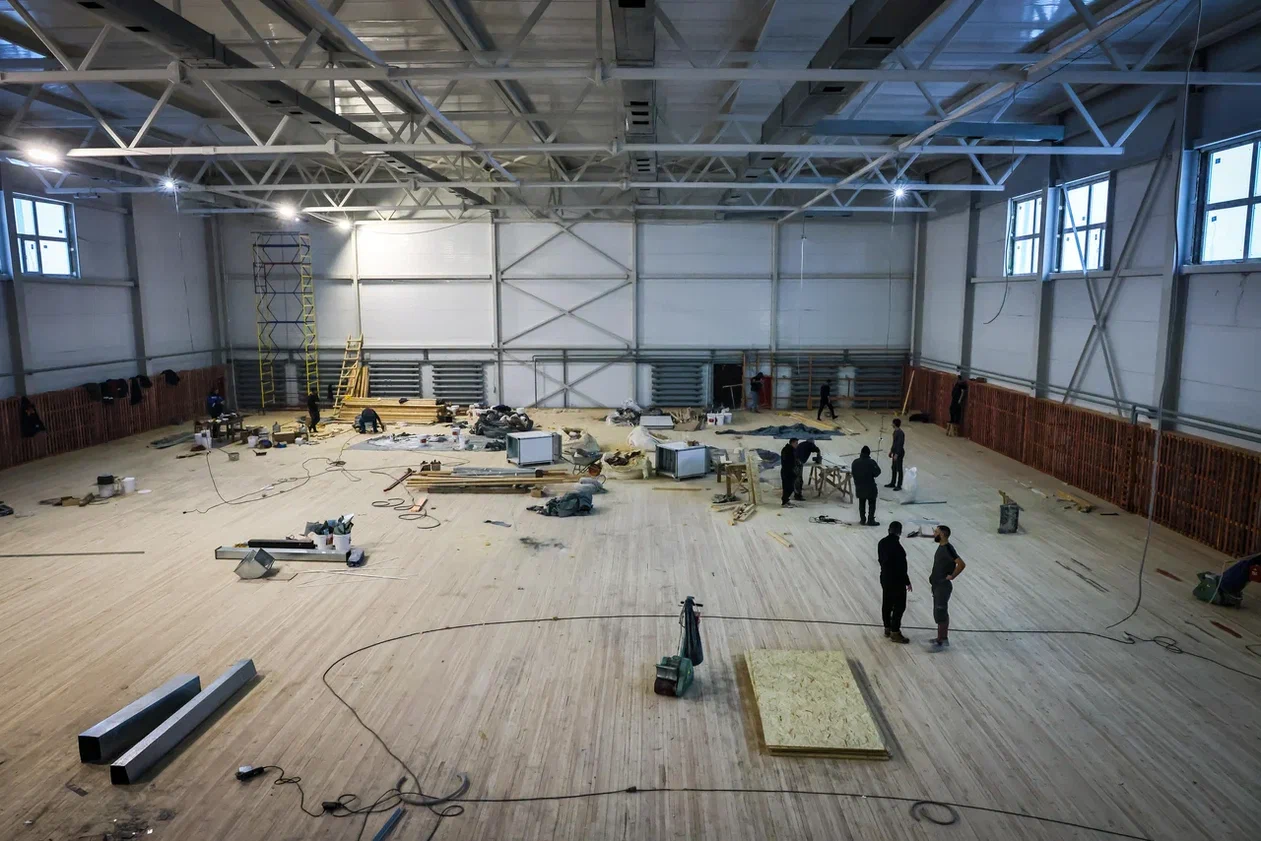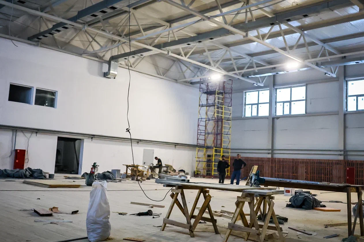 Сейчас в новом спортивном комплексе идёт внутренняя отделка помещений: подготовка стен под окраску, облицовка полов плиткой и деревянной доской. На объекте работают 35 строителей разного профиля.