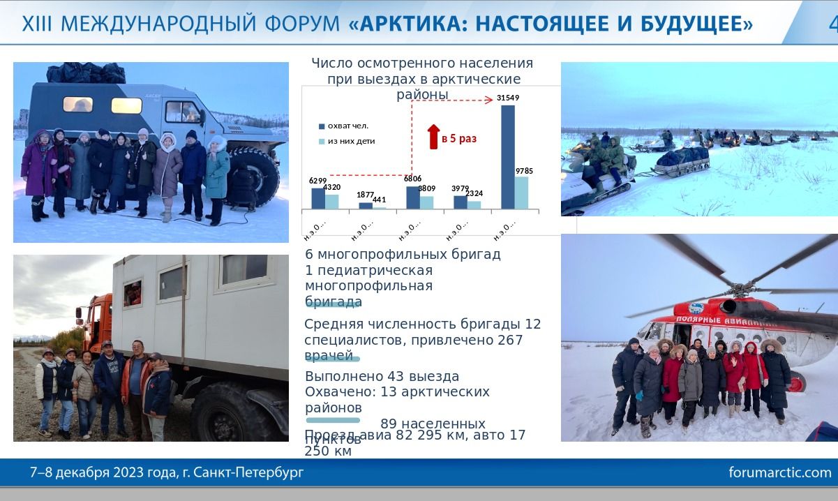 Ольга Балабкина рассказала о проекте новой модели здравоохранения в Арктике, реализуемом по инициативе Главы региона Айсена Николаева, в рамках которого мобильные бригады врачей оказывают выездную первичную специализированную медицинскую помощь, посещая каждый отдалённый труднодоступный населённый пункт Арктики, в том числе по маршрутам кочевых коренных малочисленных народов. «Для реализации проекта задействованы все вида транспорта: воздушные суда, вездеходы, речные катера. В результате охват выездной первичной медицинской помощи в населенные пункты Арктики увеличился в два раза, охват количества населения – в пять раз. Впервые начата работа по диспансерному наблюдению пациентов с применением телемедицинских технологий», – рассказала она.