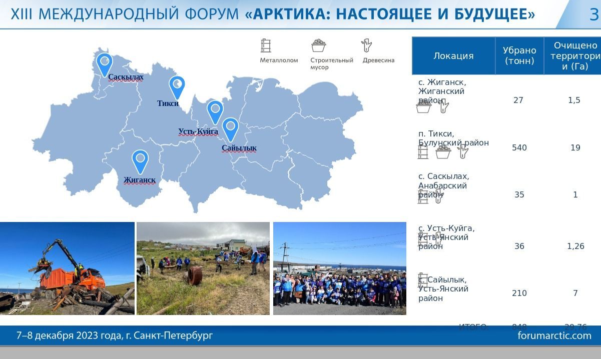 В этом году завершены работы по ликвидации хвостохранилища Куларской золотоизвлекательной фабрики, ежегодно реализуется федеральный проект «Чистая Арктика» по очистке территории от накопленного металлолома. Якутия стала пилотным регионом по реализации данного проекта. С момента старта проекта собрано порядка 850 тонн металлолома и других отходов.