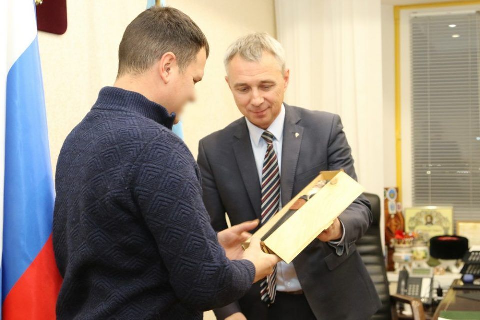 Военнослужащие Станислав и Анатолий приехали в краткосрочный отпуск из зоны спецоперации. В Удачном мэр города Артур Приходько вручил им якутские ножи, которые по поручению главы республики Айсена Николаева дарят призванным из Якутии участникам СВО, сообщает пресс-служба администрации муниципалитета.