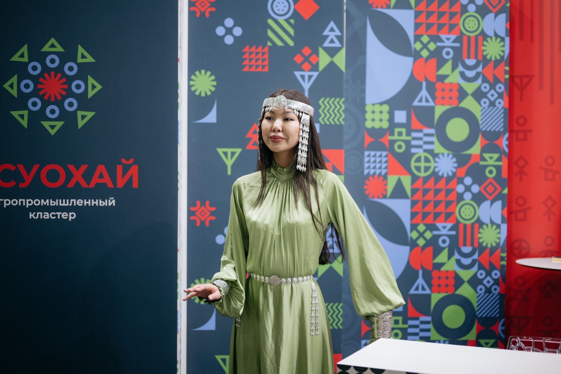 Фасад стенда АК «ОСУОХАЙ» был украшен частью урасы – традиционного жилища народа саха, национальными рунами и яркими разноцветными гирляндами – салама. В самобытный дизайн были органично вплетены современные технологии, демонстрирующие образцы передового оборудования для животноводства. В центре стенда можно было угадать образ священного древа жизни и процветания Аал Лук Мас.
