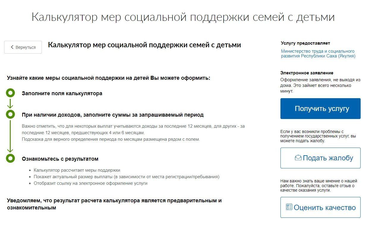«Социальный калькулятор представляет собой опросную форму, которая с помощью наводящих вопросов и предварительного расчёта доходов определит меры социальной поддержки, на которые семья может претендовать. Расчёт проводится по 22 двум мерам поддержки, и после прохождения опроса выйдет перечень мер, а также ссылки, по которым можно перейти и оформить заявление. Важно понимать, что результат получается предварительный и носит условный характер, возможно, для уточнения потребуется консультация специалиста. Получить её можно в едином контакт-центре», — отметила заместитель министра труда и соцразвития Якутии Наталья Черноусова.