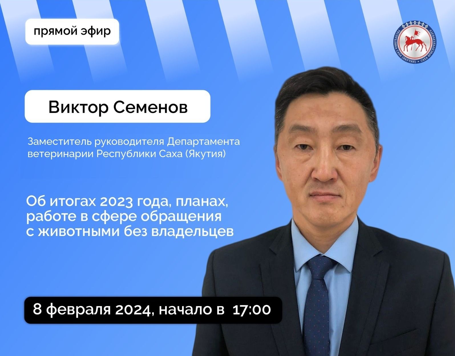 Заместитель руководителя Департамента ветеринарии Республики Саха (Якутия) Семенов Виктор Николаевич в четверг, 8 февраля 2024 года, проведет прямой эфир на официальных страницах Администрации Главы и Правительства республики SakhaGov в социальных сетях «ВКонтакте» и «Одноклассники».