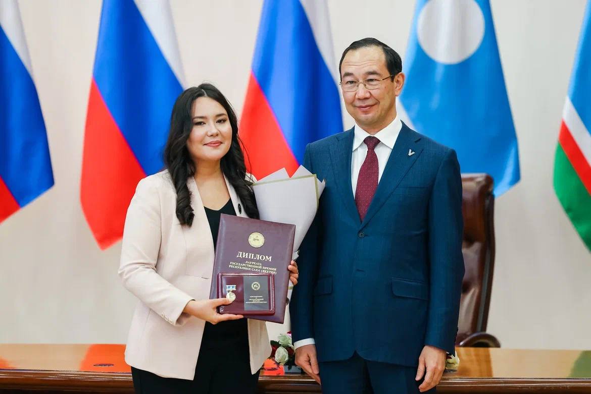 Глава Якутии Айсен Николаев в День российской науки торжественно вручил Государственную премию РС(Я) имени В.П. Ларионова в области науки и техники для молодых ученых и специалистов директору Департамента науки и инноваций Северо-Восточного федерального университета имени М.К. Аммосова», кандидату филологических наук Нинель Малышевой.