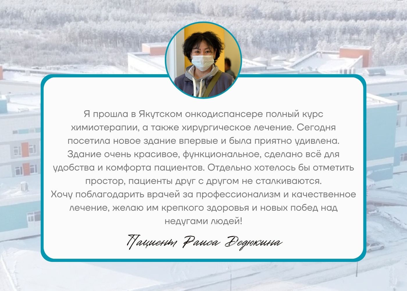 «Я прошла в Якутском онкодиспансере полный курс химиотерапии, а также хирургическое лечение. Сегодня посетила новое здание впервые и была приятно удивлена. Здание очень красивое, функциональное, сделано всё удобства и комфорта пациентов. Отдельно хотелось бы отметить простор, пациенты друг с другом не сталкиваются. Хочу поблагодарить врачей за профессионализм и качественное лечение. Желаю им крепкого здоровья и новых побед над недугами людей!» – поделилась Раиса Дедюкина.