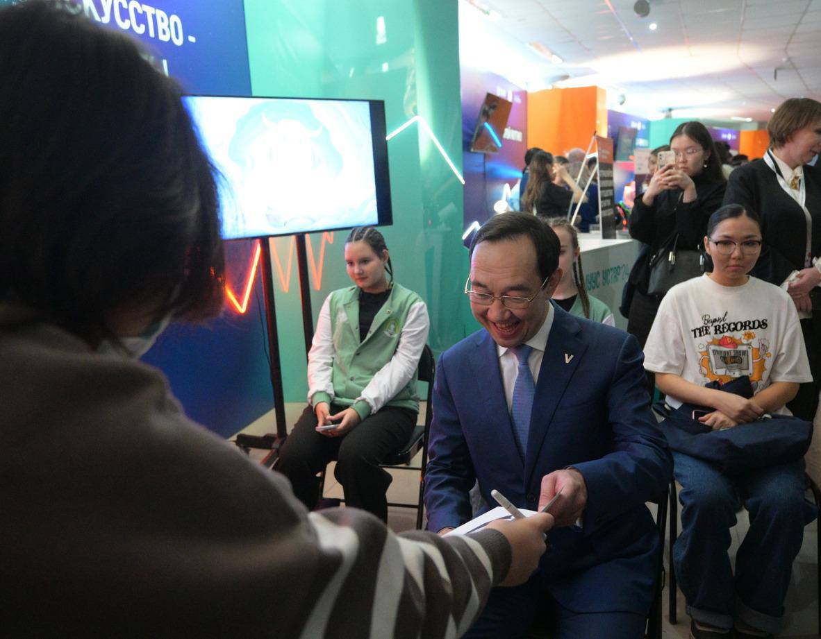 В центре спортивной подготовки «Триумф» глава республики Айсен Николаев посетил тематические выставки фестиваля «Муус устар» и пообщался с молодежью.