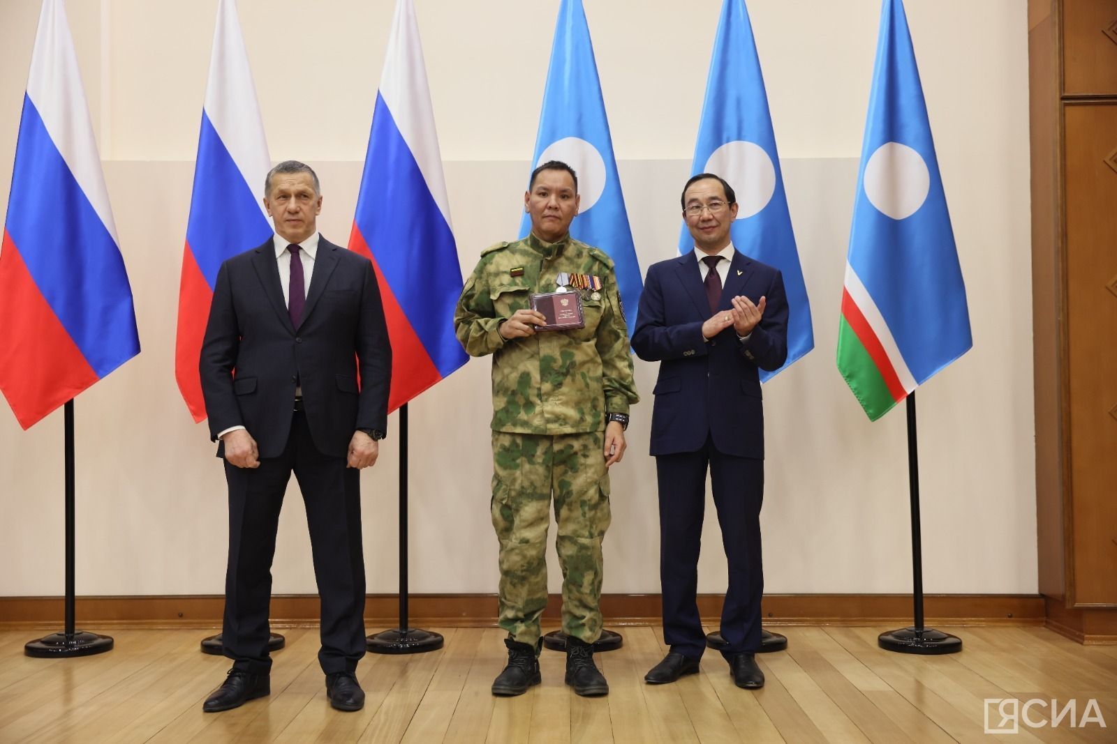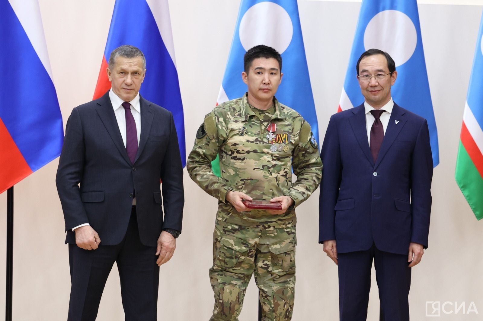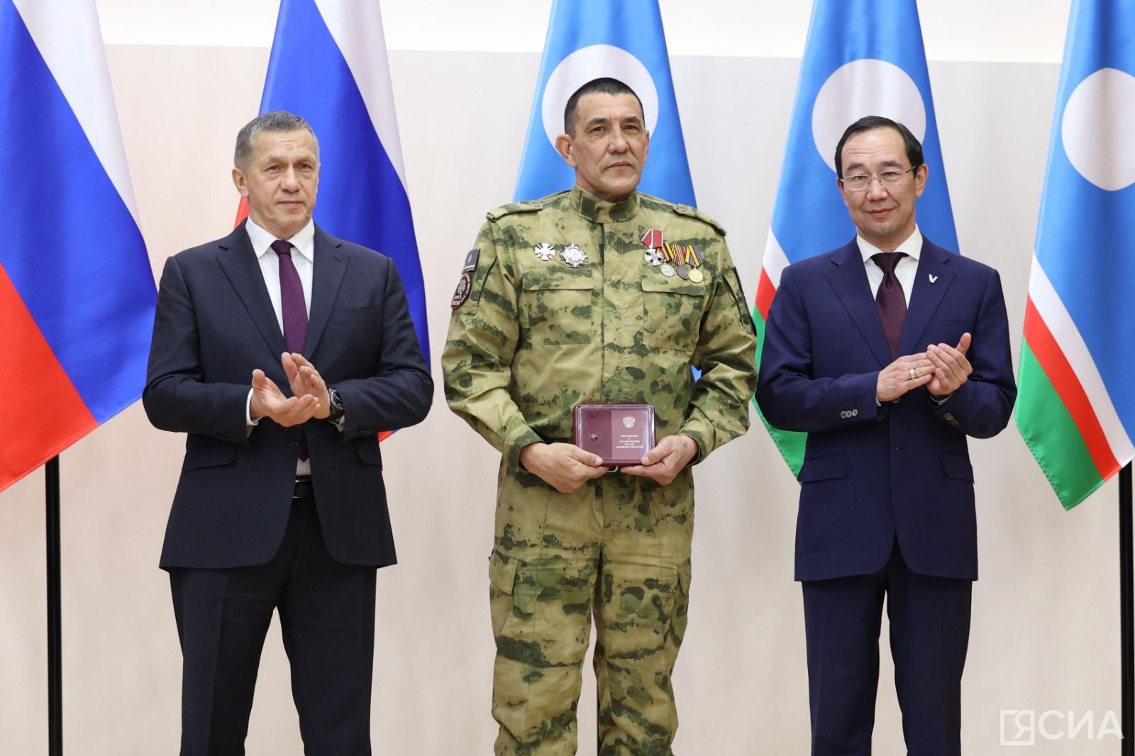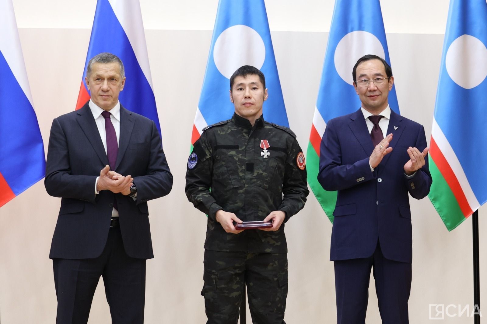 В преддверии Дня защитника Отечества в Якутске прошла торжественная церемония вручения государственных наград. Ордена Мужества и медали «За отвагу» бойцы добровольческого отряда «Боотур» и военнослужащие из Якутии получили из рук заместителя председателя правительства РФ – полпреда президента России в ДФО Юрия Трутнева. В торжественной церемонии принял участие глава республики Айсен Николаев, сообщает ЯСИА.