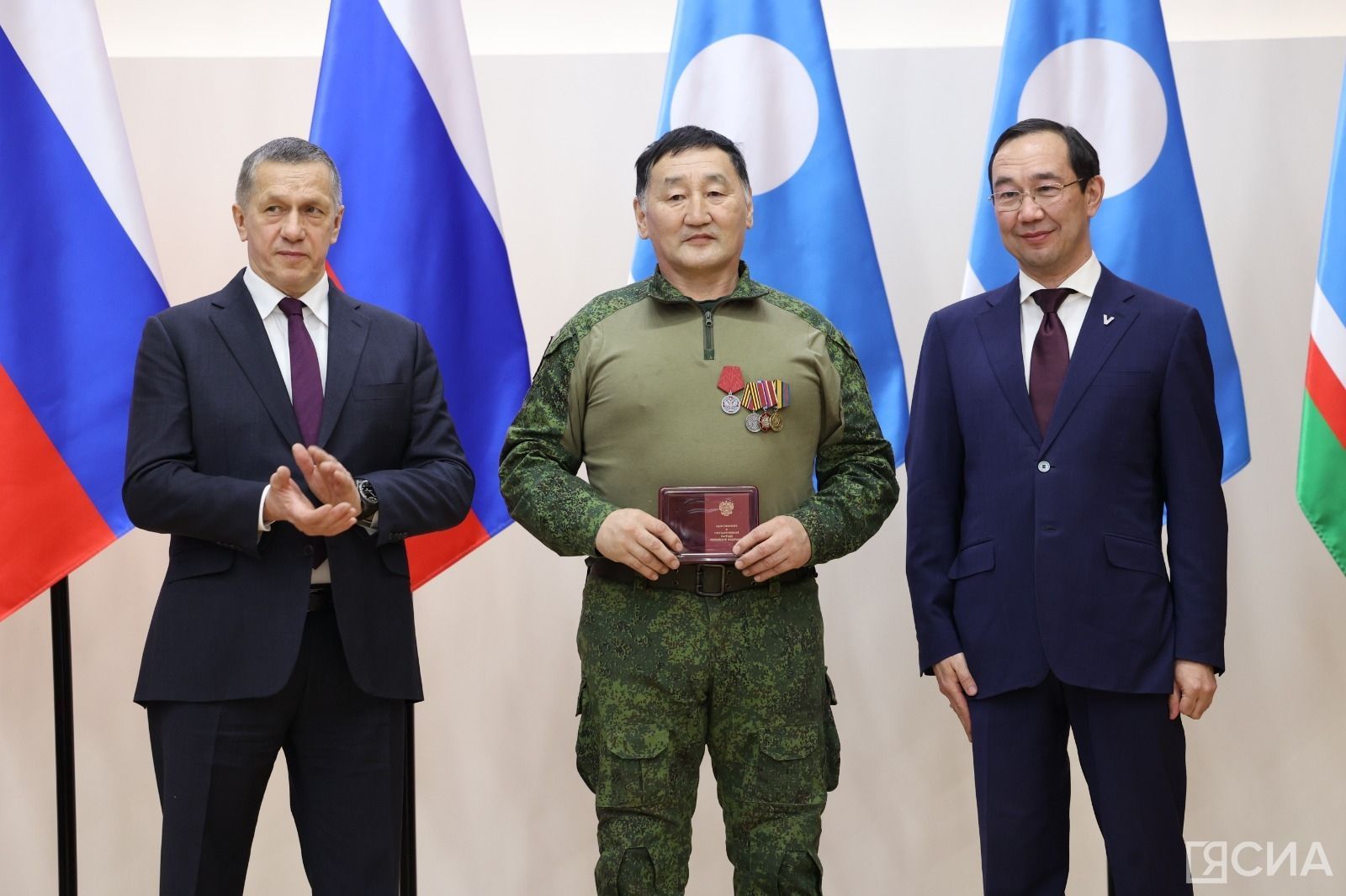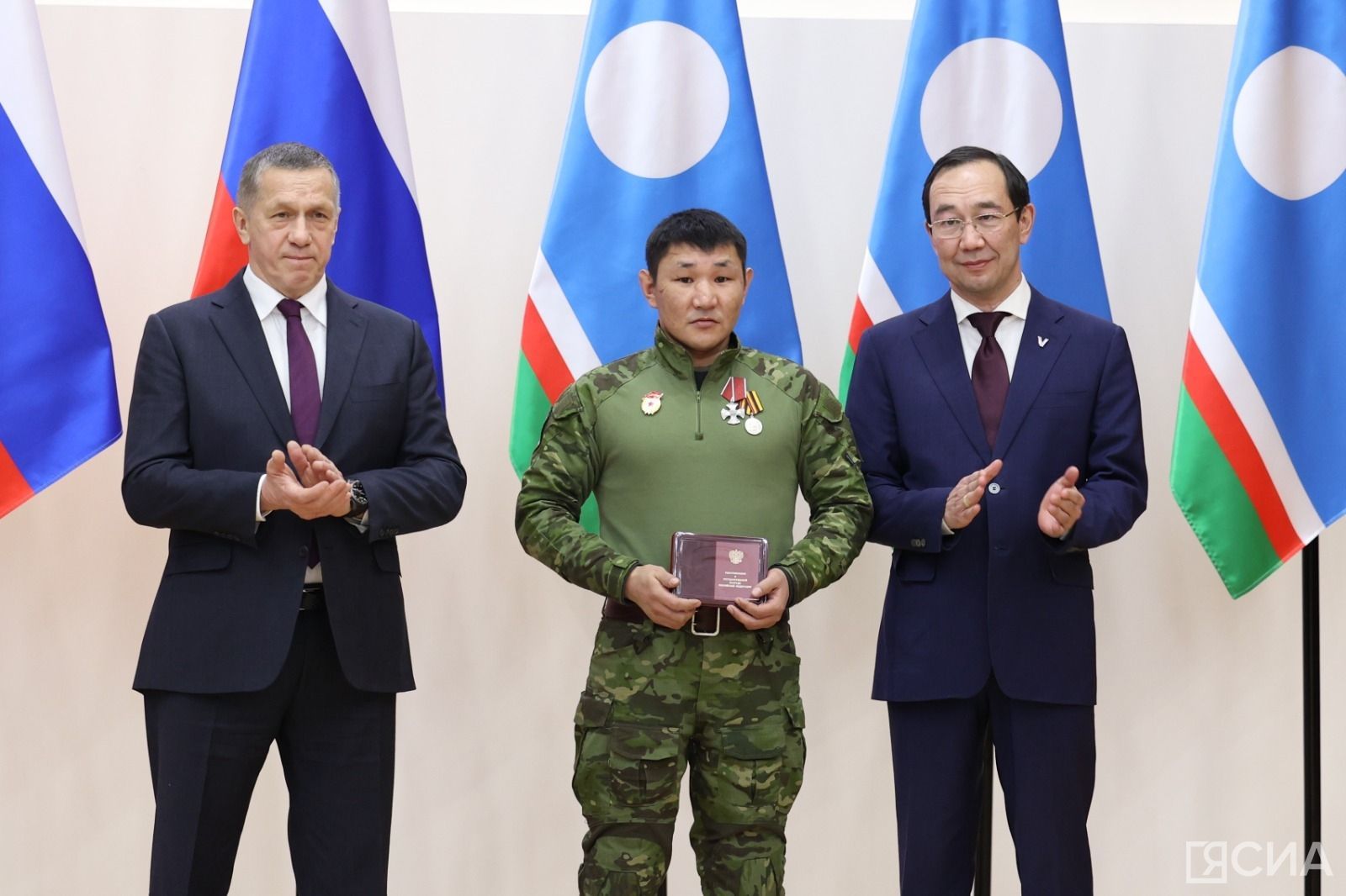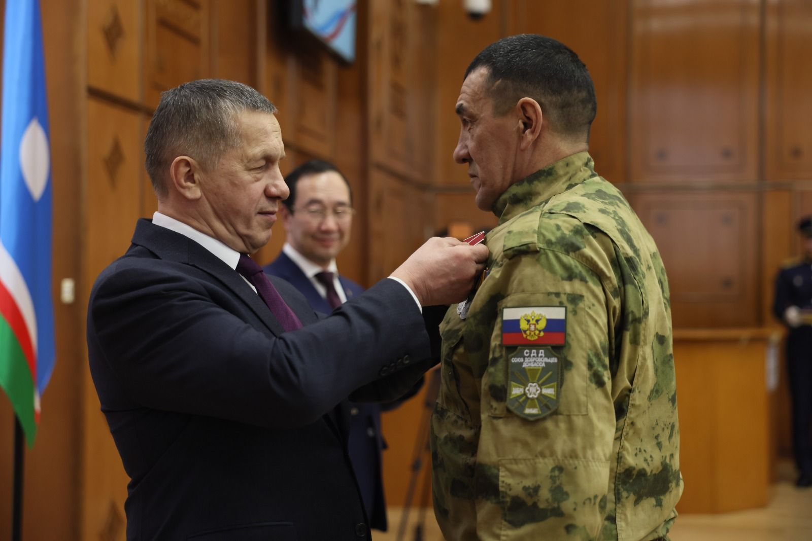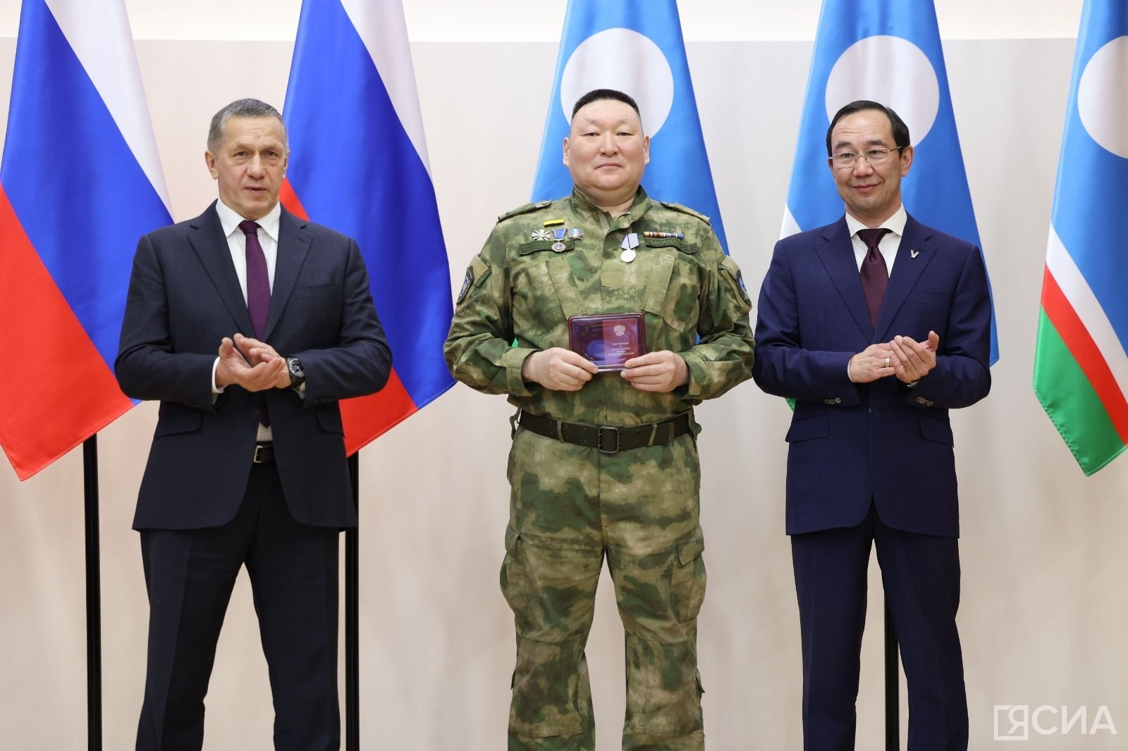 В преддверии Дня защитника Отечества в Якутске прошла торжественная церемония вручения государственных наград. Ордена Мужества и медали «За отвагу» бойцы добровольческого отряда «Боотур» и военнослужащие из Якутии получили из рук заместителя председателя правительства РФ – полпреда президента России в ДФО Юрия Трутнева. В торжественной церемонии принял участие глава республики Айсен Николаев, сообщает ЯСИА.