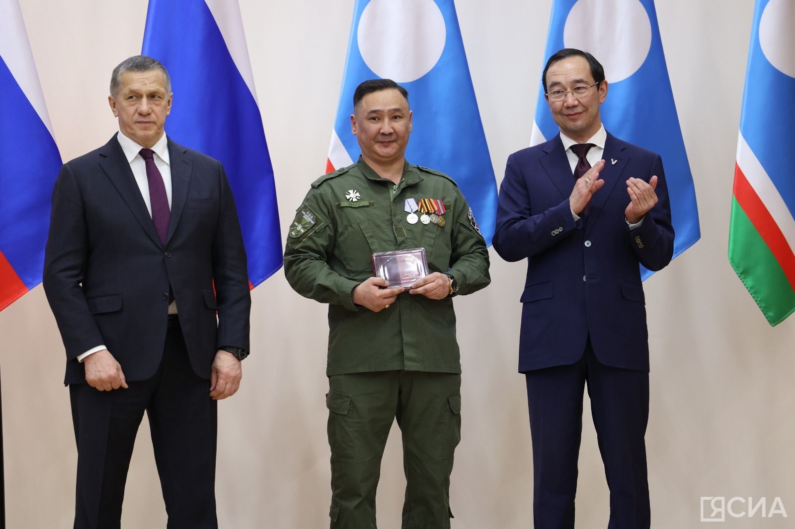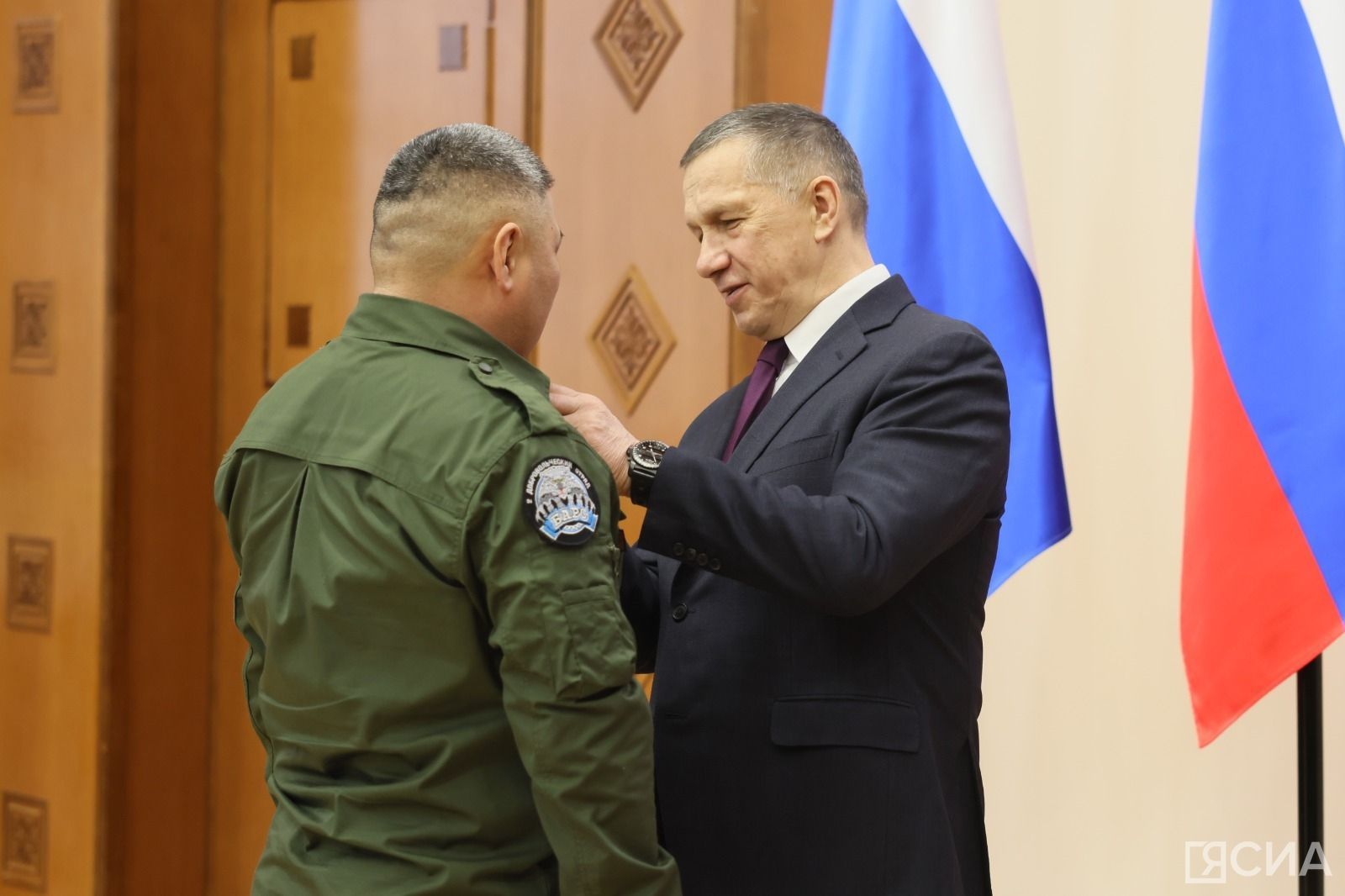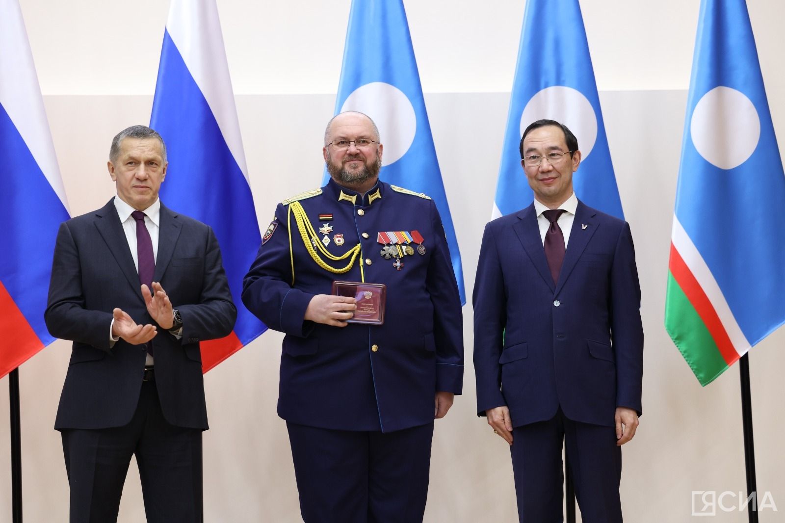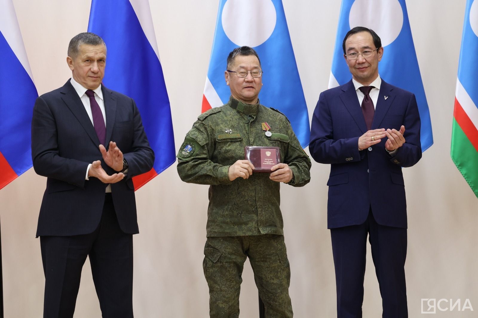 В преддверии Дня защитника Отечества в Якутске прошла торжественная церемония вручения государственных наград. Ордена Мужества и медали «За отвагу» бойцы добровольческого отряда «Боотур» и военнослужащие из Якутии получили из рук заместителя председателя правительства РФ – полпреда президента России в ДФО Юрия Трутнева. В торжественной церемонии принял участие глава республики Айсен Николаев, сообщает ЯСИА.