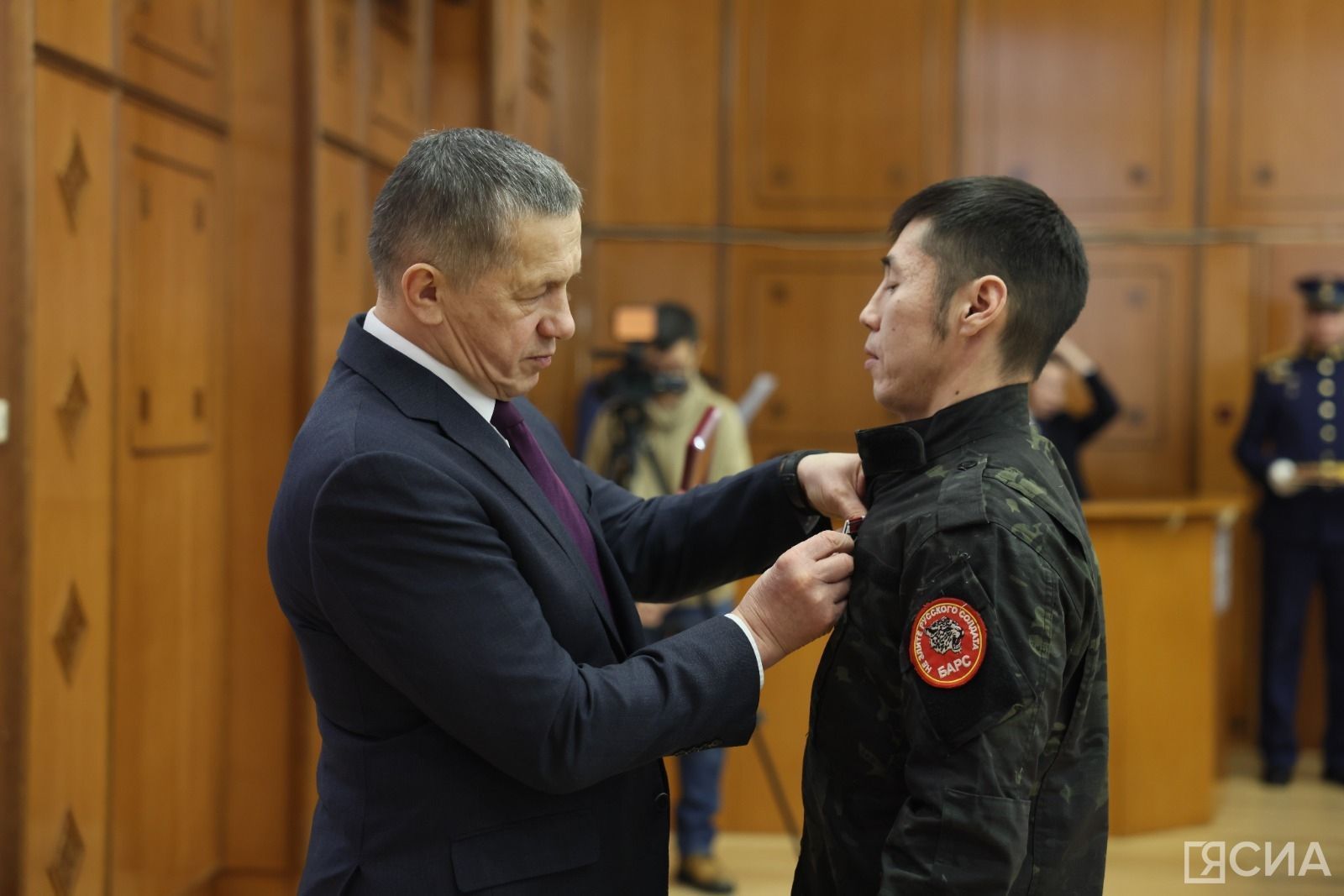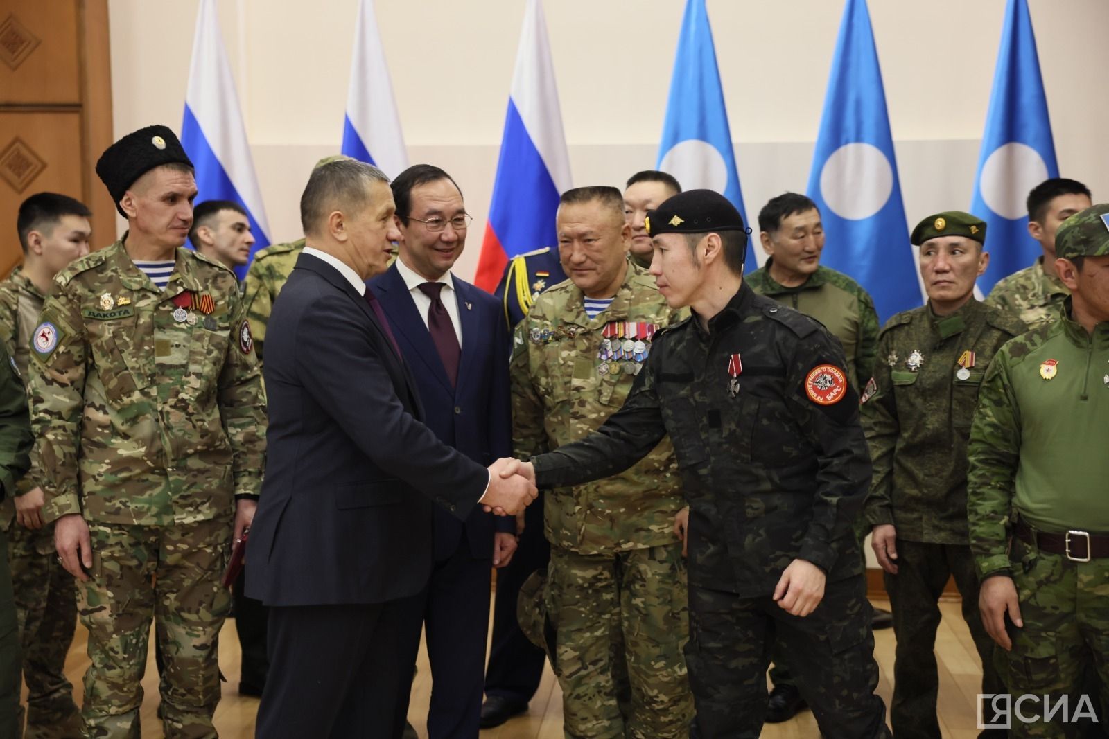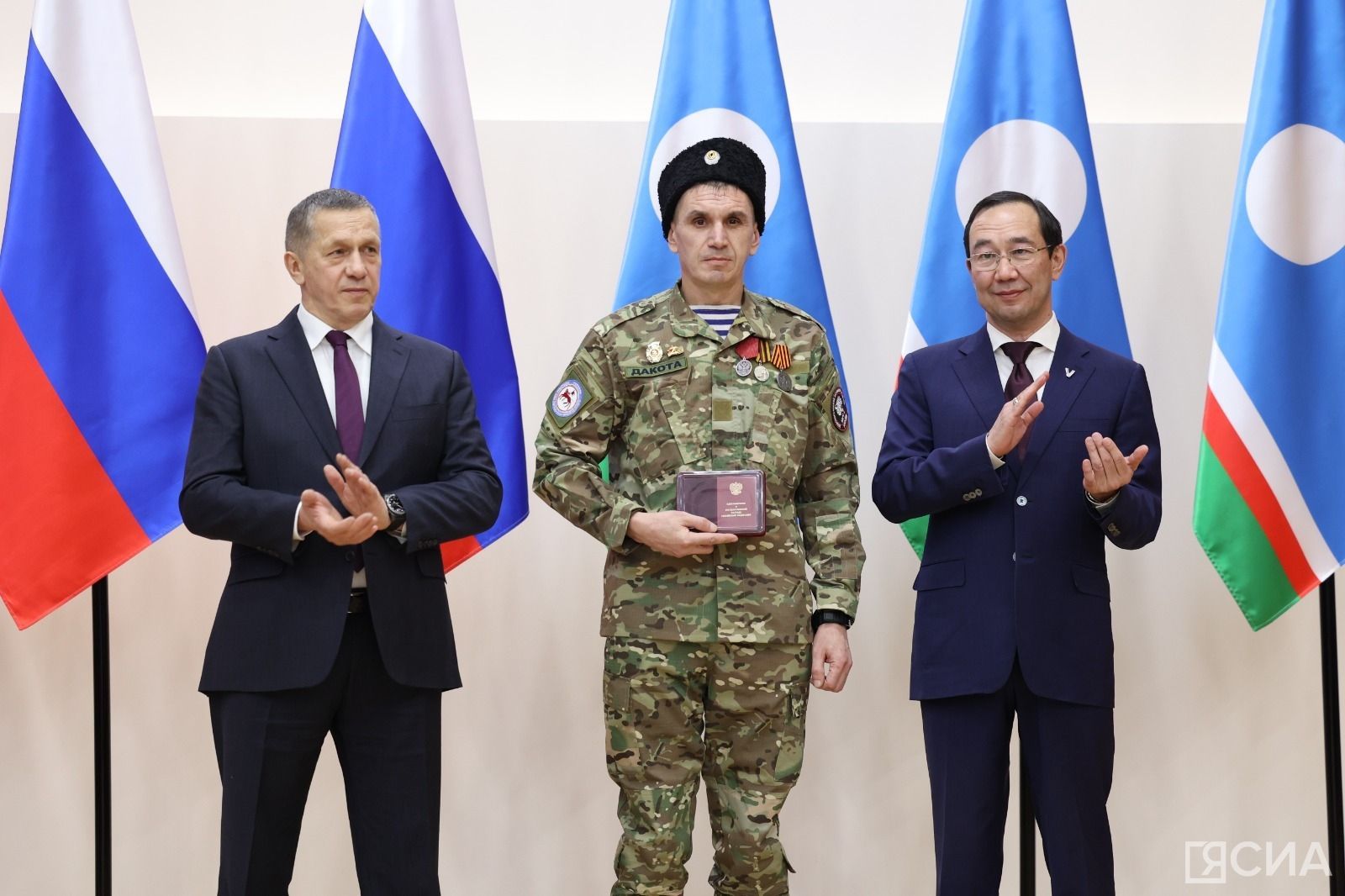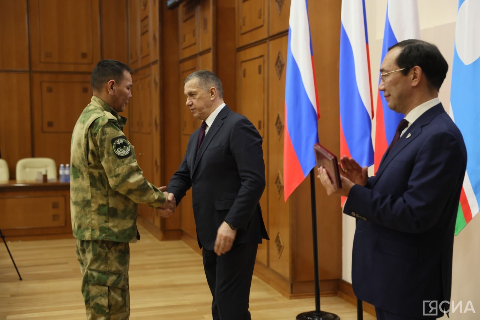 В преддверии Дня защитника Отечества в Якутске прошла торжественная церемония вручения государственных наград. Ордена Мужества и медали «За отвагу» бойцы добровольческого отряда «Боотур» и военнослужащие из Якутии получили из рук заместителя председателя правительства РФ – полпреда президента России в ДФО Юрия Трутнева. В торжественной церемонии принял участие глава республики Айсен Николаев, сообщает ЯСИА.