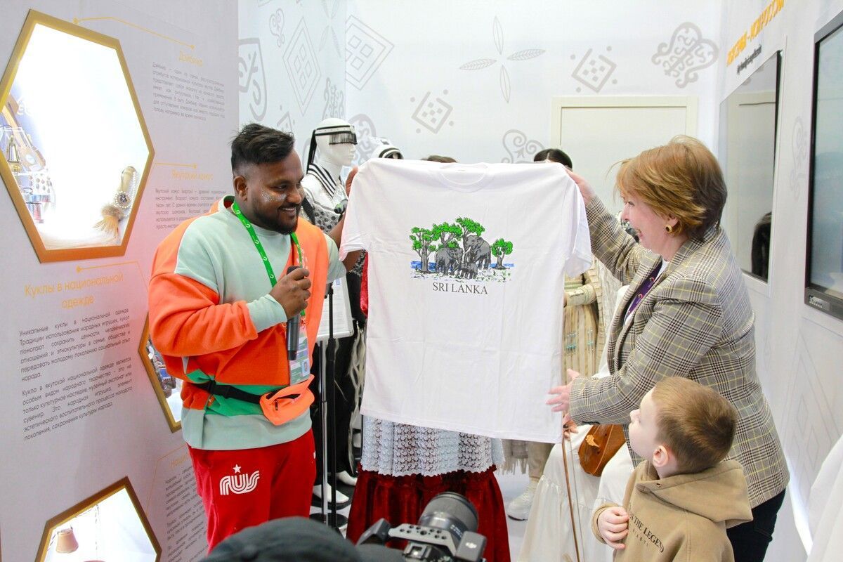 В стенде Якутии представлены национальные костюмы, украшения, атрибуты, национальная утварь и хомусы. Экспозицию региона посетили участники из разных стран и регионов России. Одним из гостей стал участник фестиваля Чамит Алутпатабандиге из Шри-Ланки, он привез с собой памятный подарок.