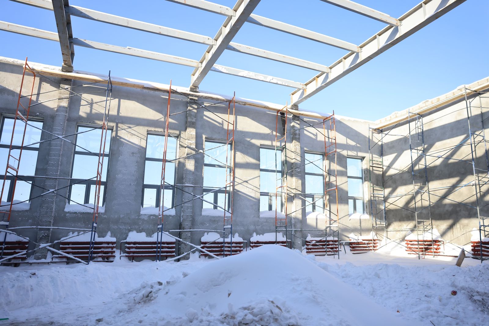Строительная готовность объекта — порядка 60%. После установки свай из-за несоответствия температуры грунтов строительство было приостановлено. Но сейчас уже ведутся работы по усилению фундамента и осуществляется доставка материалов.