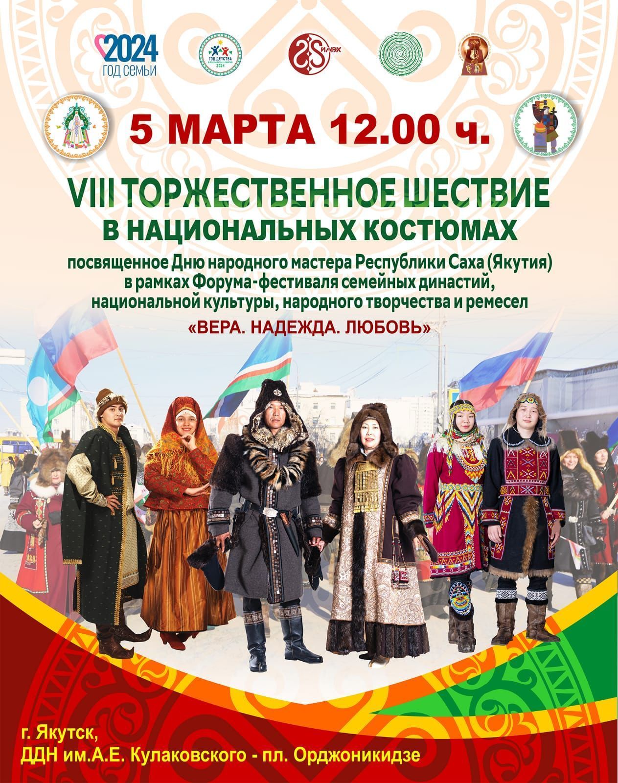 5 марта с 12.00 состоится VIII Традиционное шествие в национальных костюмах. От сквера Карла Маркса до площади Орджоникидзе пройдут свыше 1000 народных мастеров Якутии, студенты учебных заведений, национально-культурные объединения, коллективы учреждений культуры - хранители традиций народа, талантливые самородки, носители материальной и духовной культуры народов. Зрителей и участников шествия ждёт массовый, красочный яркий торжественный парад мастеров и общественности РС(Я). Только в этот день вы увидите красочное разноцветье национальных костюмов народов Якутии от самых именитых мастеров.
