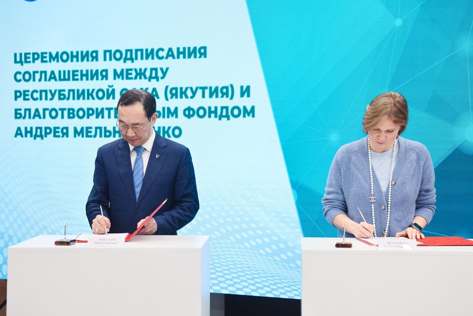 Сегодня, 18 марта, соглашение с целью противодействия изменениям климата и борьбы с их последствиями между Республикой Саха (Якутия) и Благотворительным фондом Андрея Мельниченко подписали Глава региона Айсен Николаев и генеральный директор фонда Татьяна Журавлева. Мероприятие состоялось в рамках экспертной сессии «Глобальный климатический вызов: ограничение или драйвер развития».