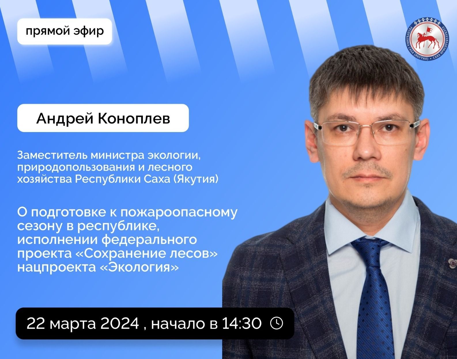 Заместитель министра экологии, природопользования и лесного хозяйства Республики Саха (Якутия) Коноплев Андрей Николаевич в пятницу, 22 марта 2024 года проведет прямой эфир на официальных страницах Администрации Главы и Правительства республики SakhaGov в социальных сетях «ВКонтакте» и «Одноклассники».