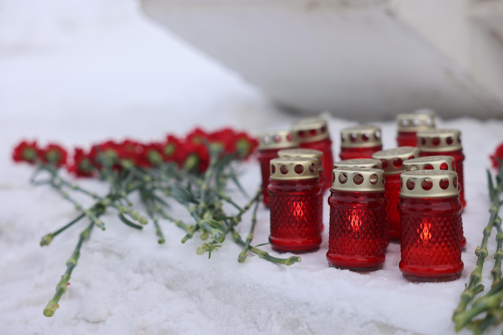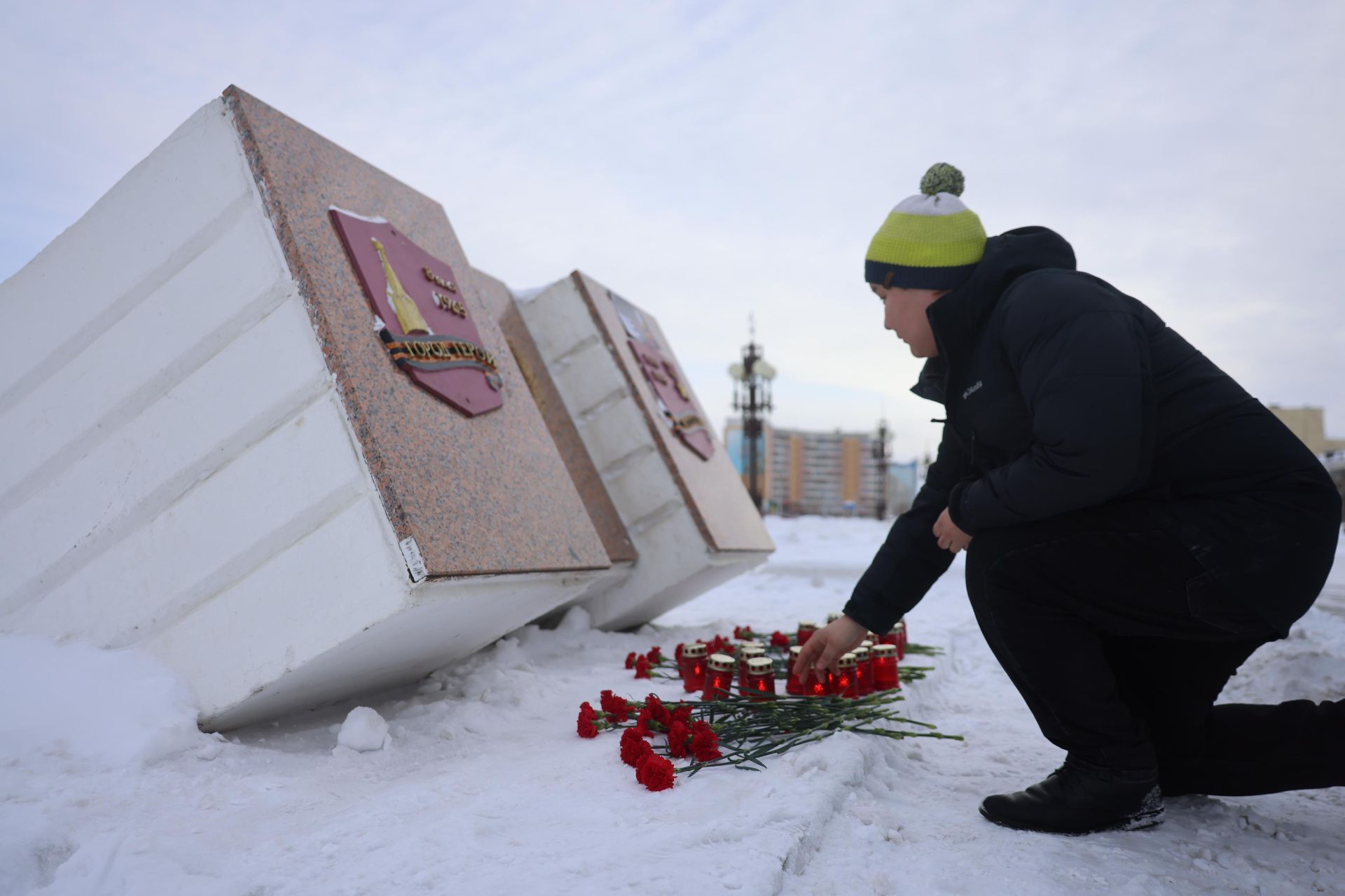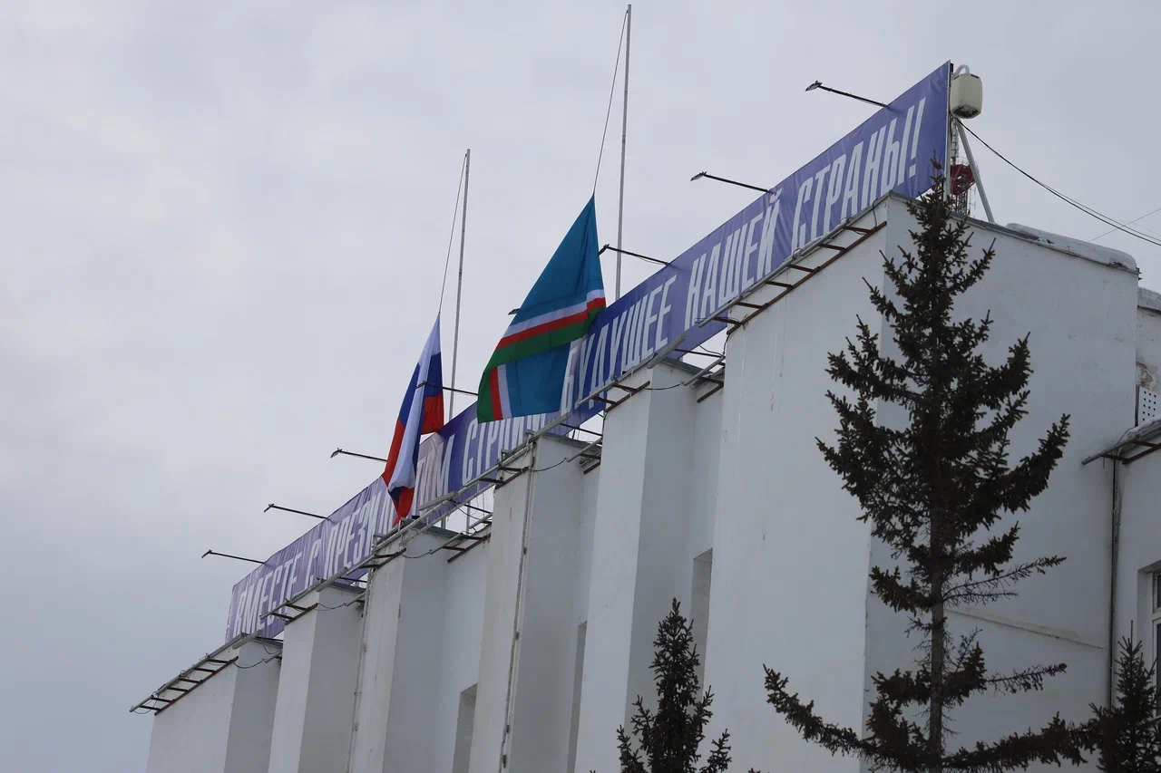 В городе появились билборды с надписью «Скорбим». Флаги над административными зданиями приспущены.