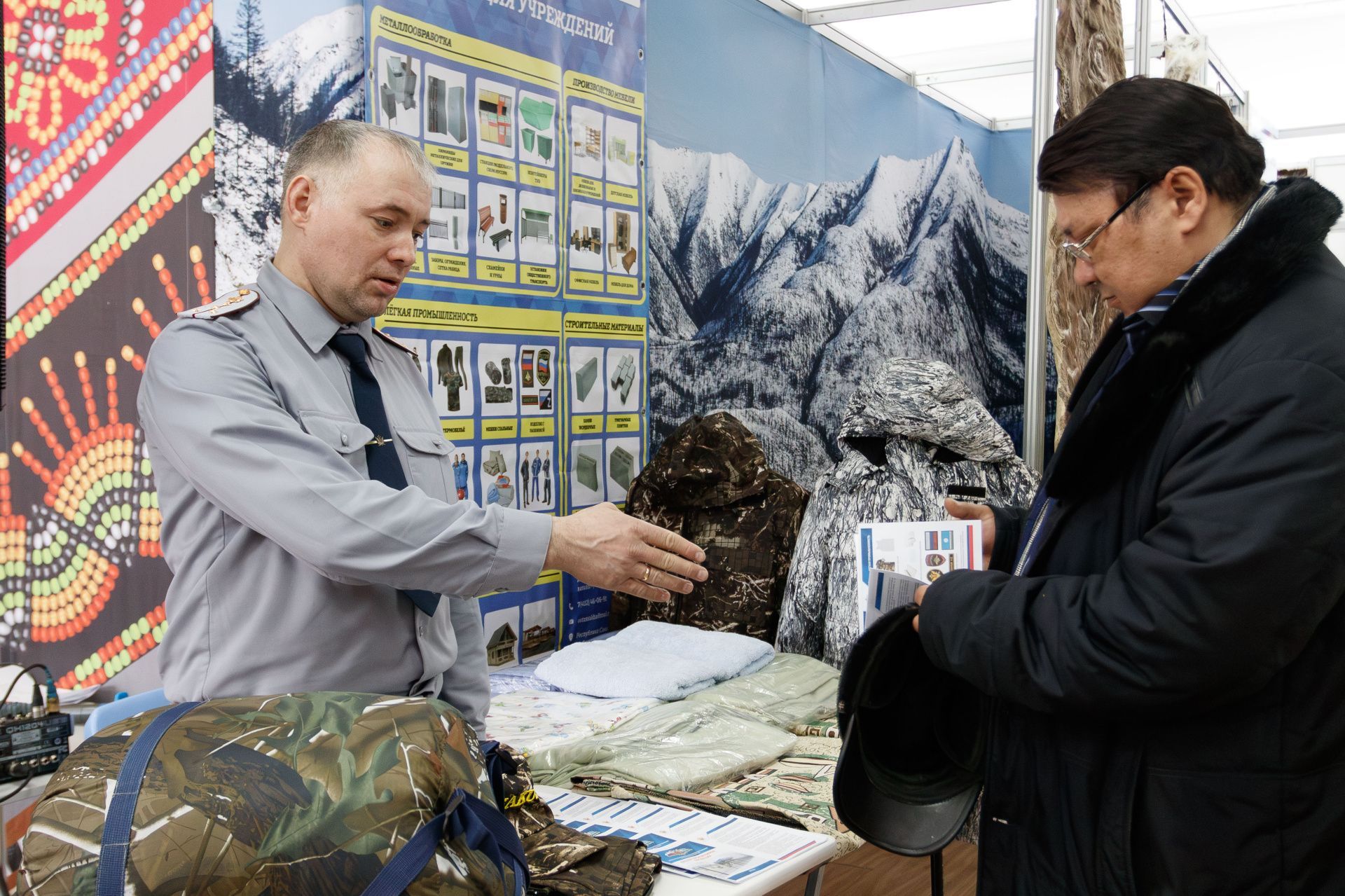 Сотрудниками центров трудовой адаптации посетителям выставки представлены изделия, сшитые осужденными. Это необходимые для традиционной в Якутии рыбалки и охоты утепленные костюмы и спальные мешки, покрывала в национальном стиле и другие швейные изделия.