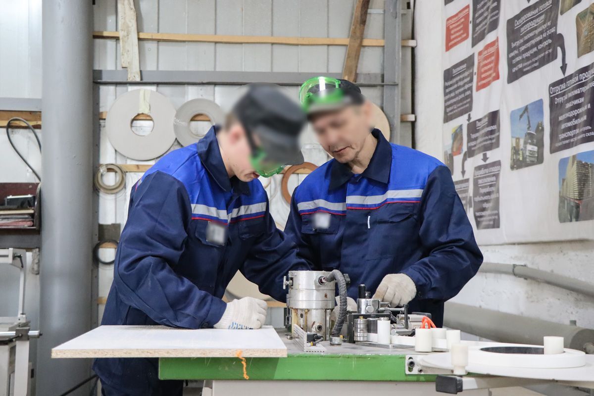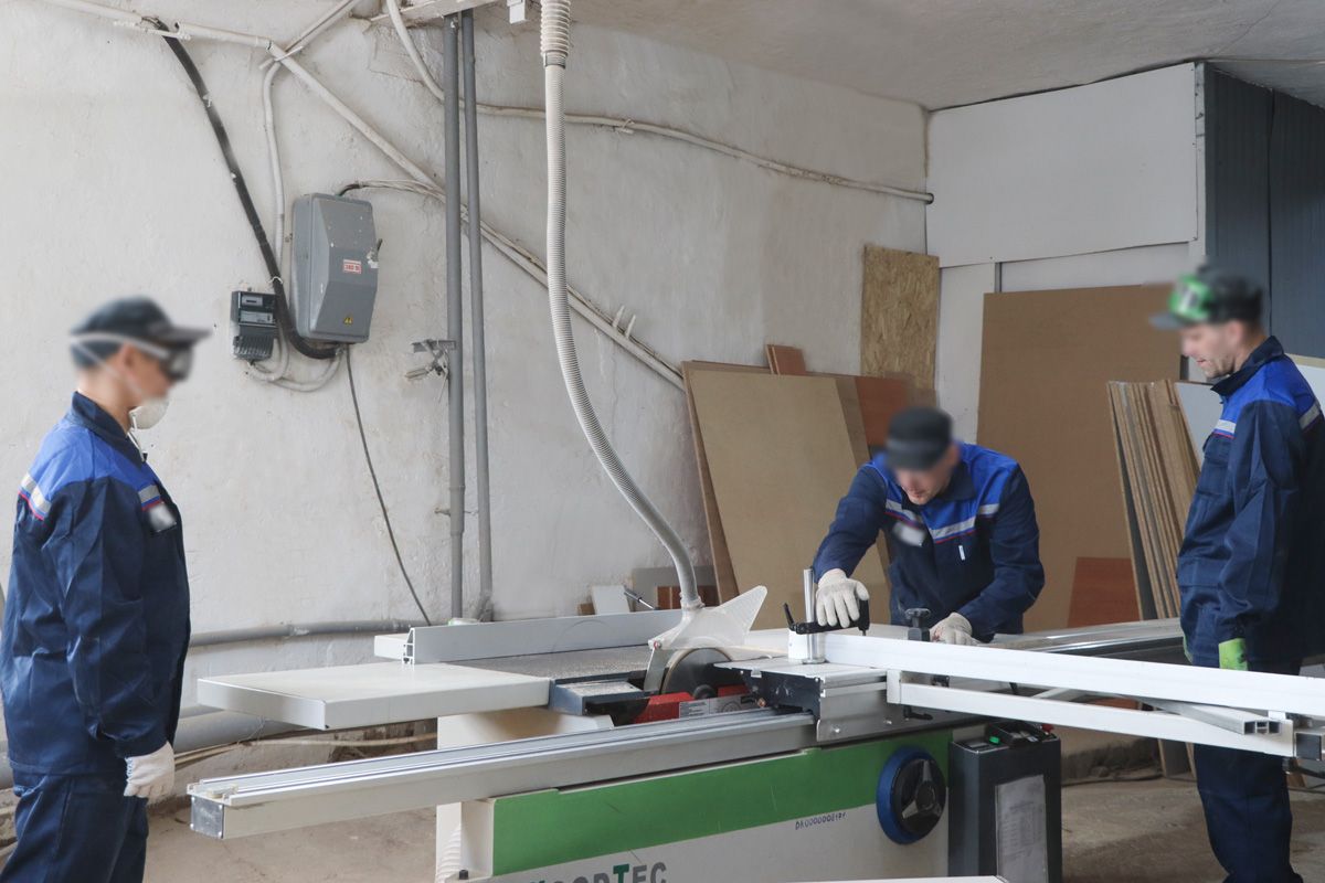 В цехе строго соблюдают все технологические требования. Сначала заготовки заносят в цех со склада, дают им отогреться до комнатной температуры, и только потом приступают к нарезке на необходимые детали. Действуют осуждённые слаженно, быстро, не допуская простоя на линии. После раскройки детали передают на облицовочный станок, затем на установку фурнитуры и финальную сборку.