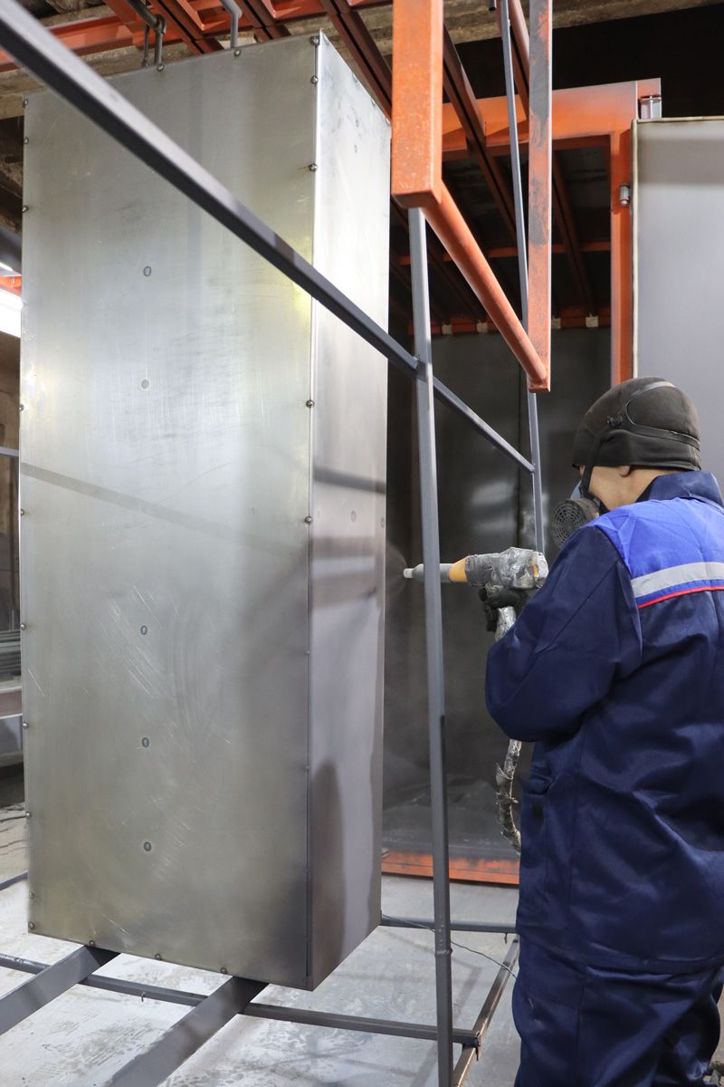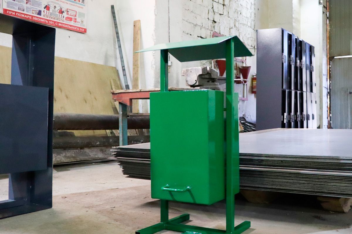 Чтобы уменьшить количество сварных швов был приобретён специальный станок для загибания металла. В цехе есть и большой аппарат, который может за пару секунд очень точно нарезать металлические листы, что ускоряет процесс работы. Но главная фишка всех изделий – качественное покрытие полимерной краской. После сварки заготовки изделие перемещают на специальный подвес, обрабатывают из распылителя и примерно на час помещают в сушильный шкаф. В нём краска полимеризуется и превращается в антивандальное, устойчивое к коррозии покрытие.