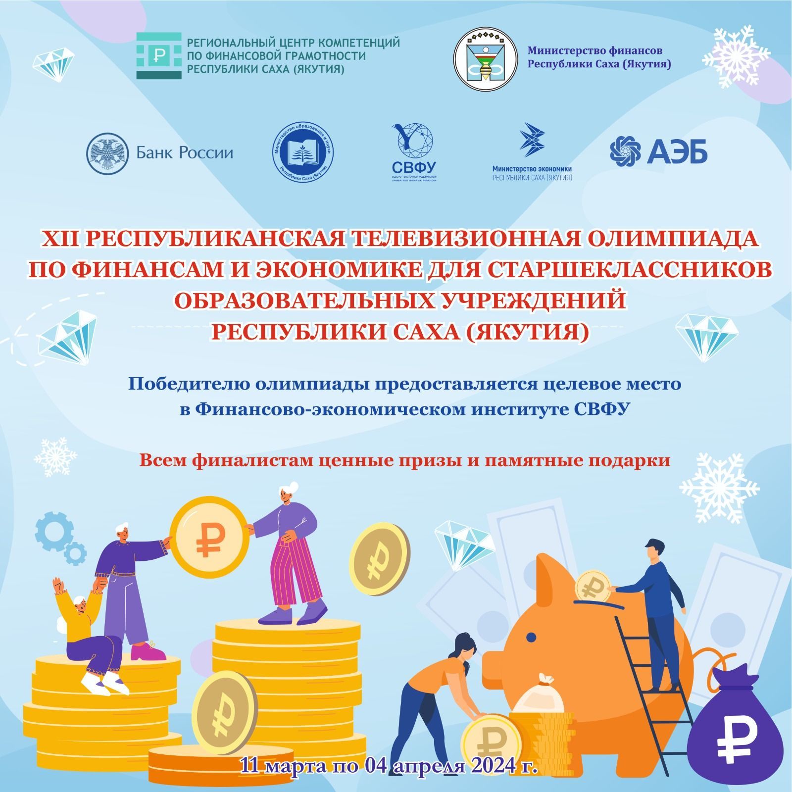 Все финалисты Олимпиады награждаются дипломами и памятными подарками. Победитель Олимпиады во II группе получает право зачисления на целевое место в ФЭИ ФГАОУ ВО «СВФУ им. М.К. Аммосова» по направлению «Экономика. Финансы и кредит» при условии успешной сдачи вступительных испытаний не ниже установленных границ ЕГЭ.