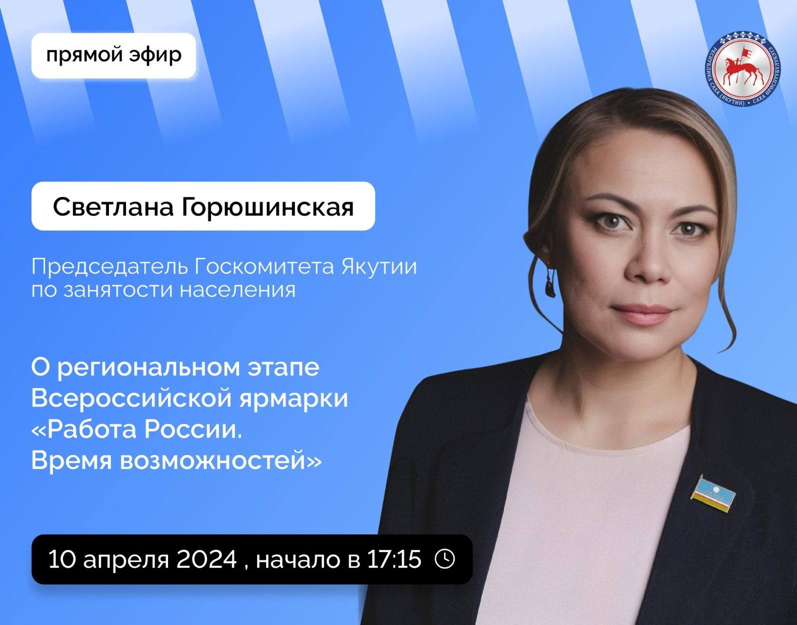 Председатель Госкомитета Республики Саха (Якутия) по занятости населения Горюшинская Светлана Валентиновна в среду, 10 апреля 2024 года, проведет прямой эфир на официальных страницах Администрации Главы и Правительства республики SakhaGov в социальных сетях «ВКонтакте» и «Одноклассники».