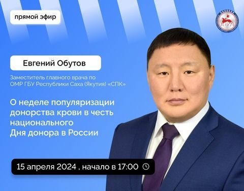 Заместитель главного врача по ОМР ГБУ Республики Саха (Якутия) «СПК» Обутов Евгений Алексеевич в понедельник, 15 апреля 2024 года проведет прямой эфир на официальных страницах Администрации Главы и Правительства республики SakhaGov в социальных сетях «ВКонтакте» и «Одноклассники».