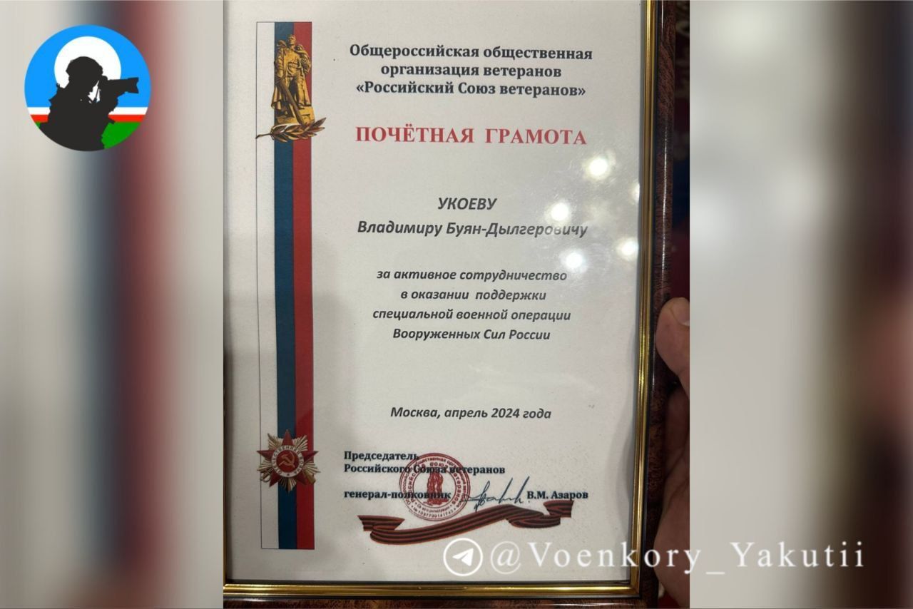 Военный корреспондент холдинга «Сахамедиа» Владимир Укоев награжден почетной грамотой Российского союза ветеранов.