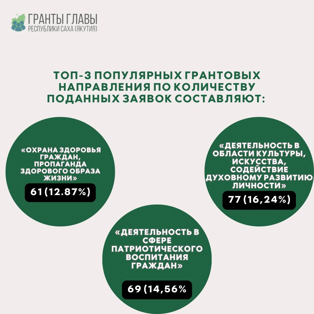 Топ-3 популярных грантовых направления по количеству поданных заявок составили «Деятельность в области культуры, искусства, содействие духовному развитию личности» – 77 проектов (16,24%), «Деятельность в сфере патриотического воспитания граждан» – 69 (14,56%), «Охрана здоровья граждан, пропаганда здорового образа жизни» – 61 проект (12.87%).