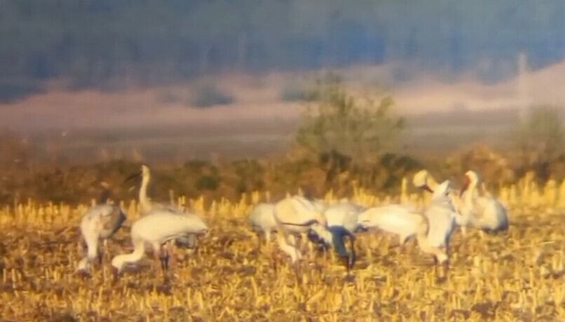 «Сначала мы наблюдали их в скоплении даурских и чёрных журавлей, которые уже 2 недели сидят в заболоченной пади перед усадьбой парка, а вечером стерхи перелетели на кормёжку на кукурузное поле. В стае хорошо различимы молодые птицы прошлого года вылупления, у которых присутствуют рыжие вкрапления в оперении, и взрослые, с чисто белым окрасом», – рассказали в парке.