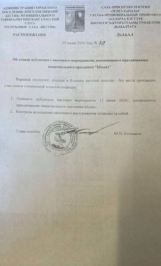 В райцентре Мегино-Кангаласского улуса — в поселке Нижний Бестях — распоряжением главы муниципального образования Юрия Колмакова отменен якутский национальный праздник «Ысыах» («Ыhыах»), ранее запланированный на 12 июня 2024 года — в День России, в календарный выходной день (среда).