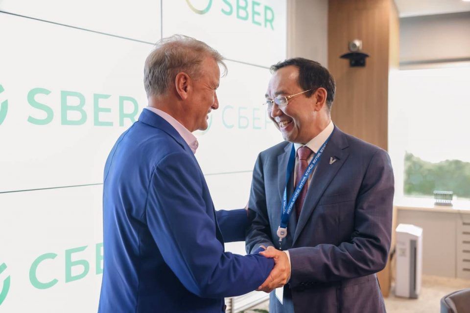 Реализацию совместных проектов в IT-отрасли обсудили на Восточном экономическом форуме президент, председатель правления Сбербанка Герман Греф и глава Якутии Айсен Николаев.