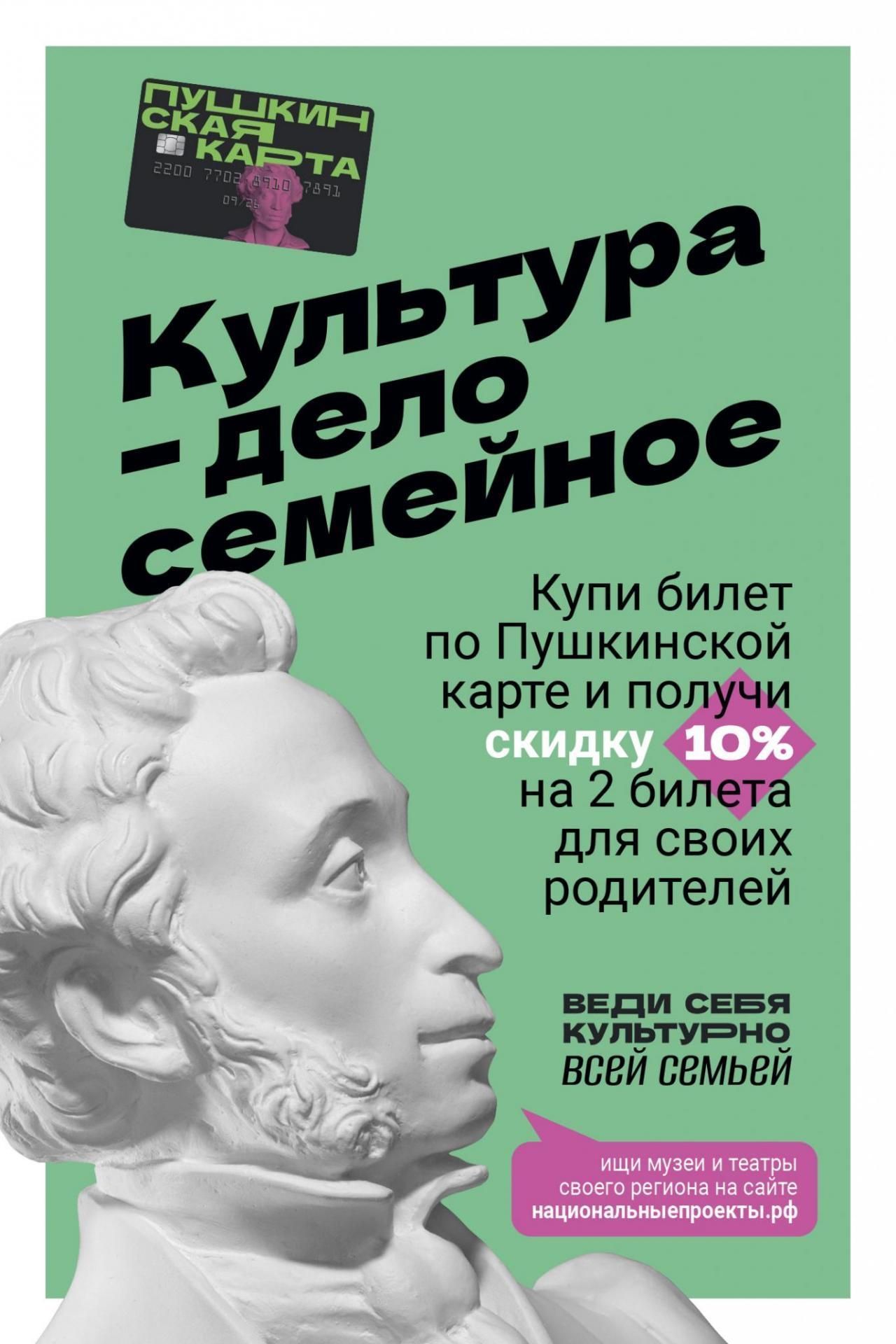 С 30 декабря 2024 года по 12 января 2025 года по всей стране пройдет уникальная акция для владельцев Пушкинской карты «Веди родителей в музей». Теперь при покупке билета по Пушкинской карте посетитель сможет получить скидку 10% на покупку двух билетов для своих родителей. Такая возможность появится в более тысячи учреждений культуры в регионах России.