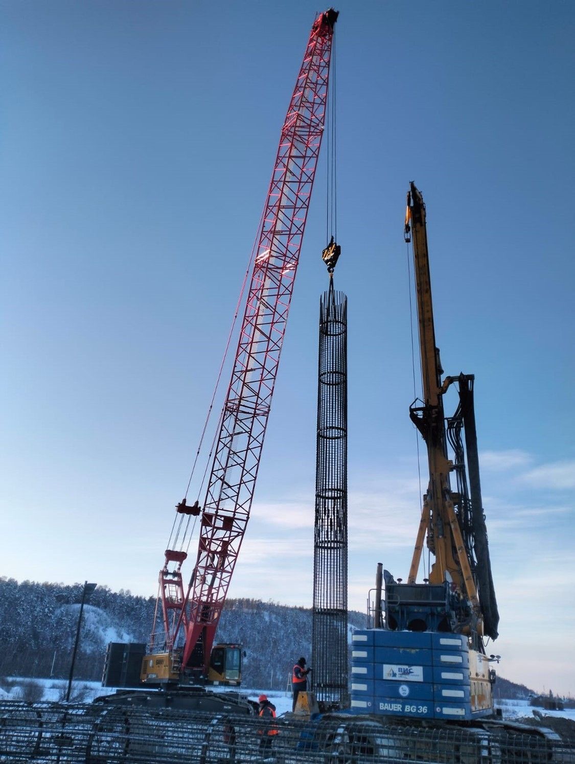Параллельно на двух технологических площадках на обоих берегах изготавливаются металлические армокаркасы для свай. Готово к установке 73 таких каркаса, которые опускаются в пробуренные скважины перед заливкой бетона.