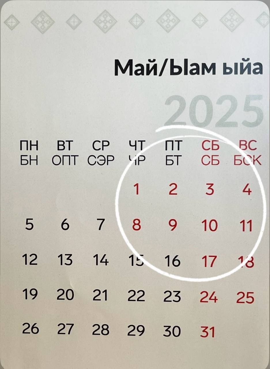 Выходные дни: 1 мая (Праздник Весны и Труда), 8 и 9 мая (День Победы).