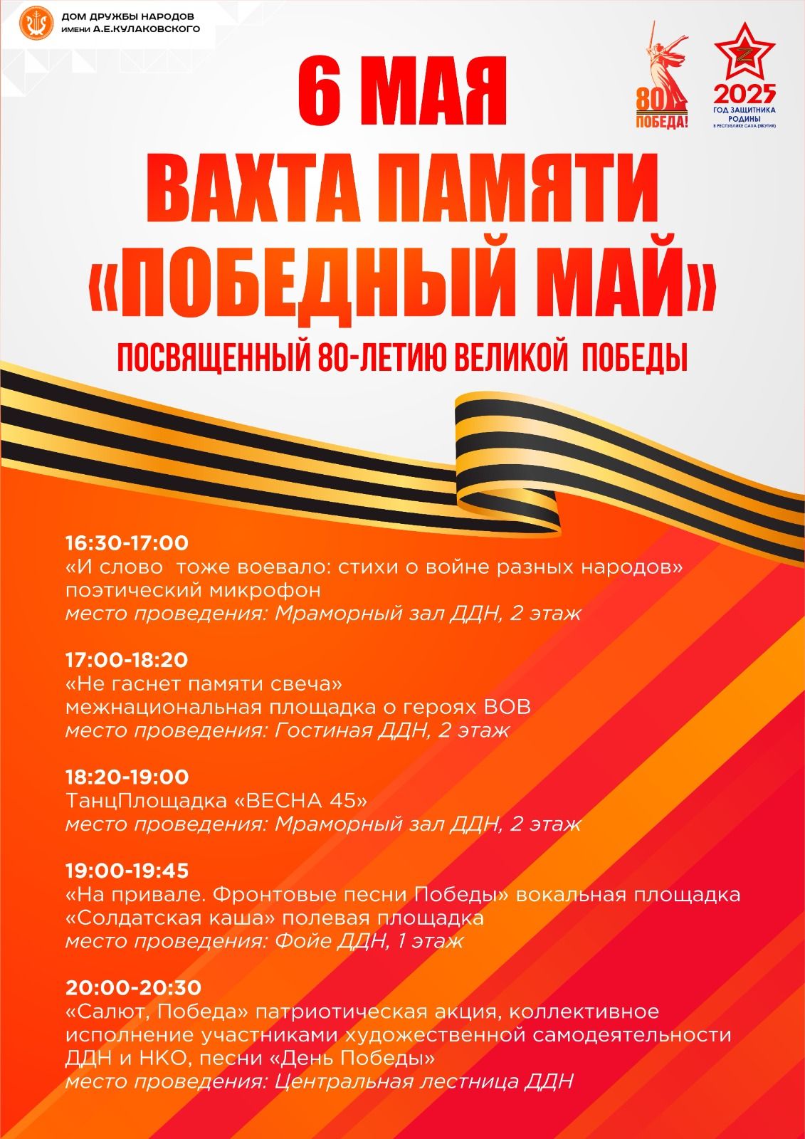 6 мая в Доме дружбы народов им. А. Е. Кулаковского в рамках празднования 80-летия Великой Победы состоится народный проект — ВАХТА ПАМЯТИ «ПОБЕДНЫЙ МАЙ»!