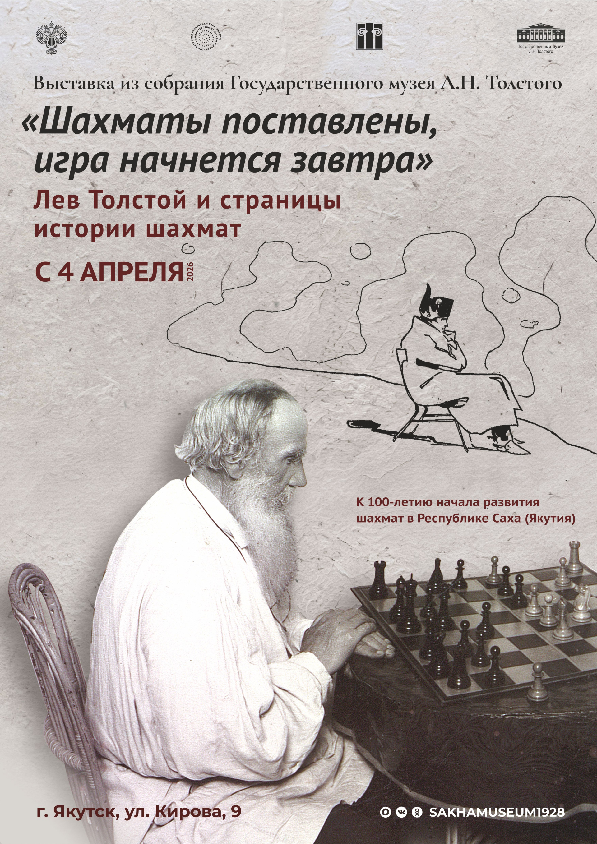Выставка соединяет два культурных пласта: увлечение шахматами Льва Толстого и историю игры в Якутии. Большая часть экспонатов – рукописи, фотографии, предметы изобразительного искусства – говорит об увлечении великого писателя шахматами на протяжении почти всей жизни. Дополняют коллекцию экспонаты из фондов Национального художественного музея. Представлены уникальные шахматы «Олонхо», выполненные из бивня мамонта народным художником ЯАССР, лауреатом премии им. Репина Терентием Аммосовым.