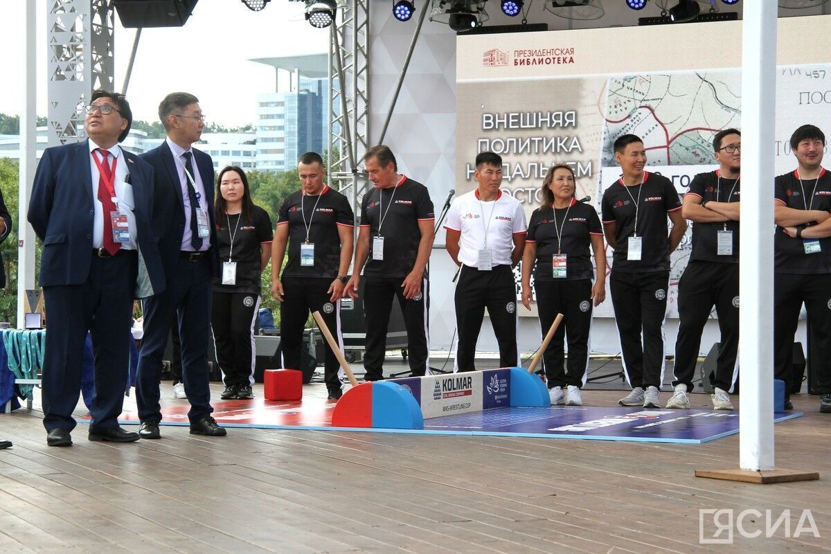 Олег Матыцин также встретился с участниками международного турнира по мас-рестлингу «Кубок Колмара», который проходит в рамках ВЭФ-2023. В этом году в соревнованиях по якутскому национальному виду спорта участвуют 24 спортсмена из 19 стран мира.