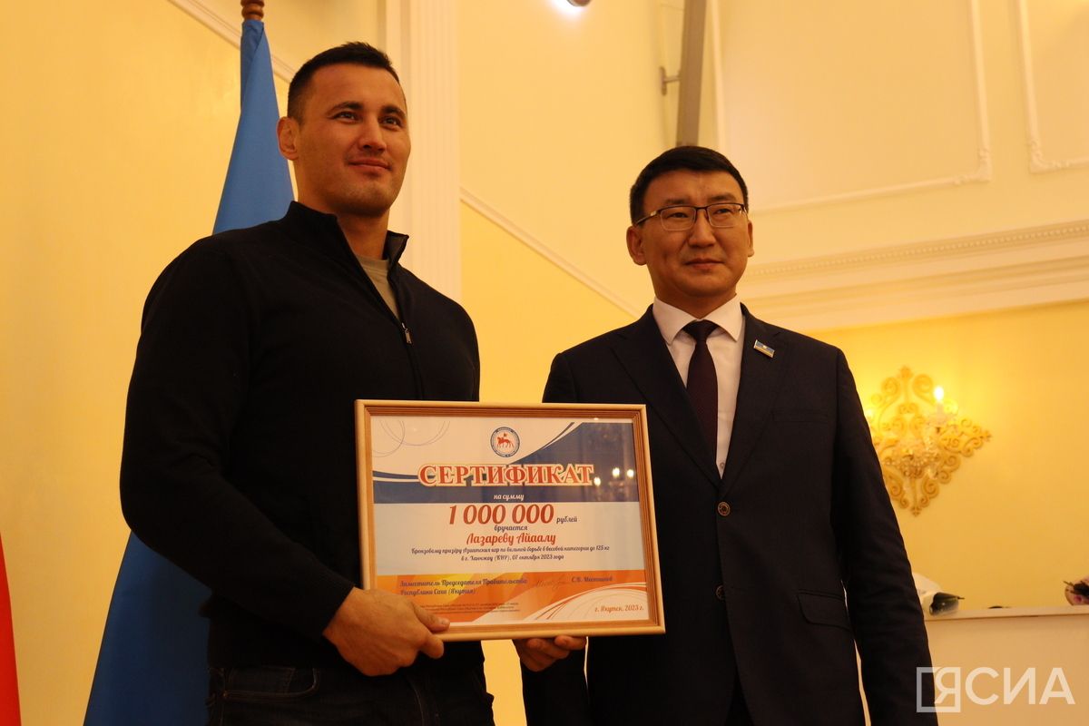 Заместитель председателя правительства Якутии Сергей Местников от лица руководства республики вручил борцу Айаалу Лазареву и легкоатлетке Сардане Трофимовой по миллиону рублей за успешное выступление на Азиатских играх, сообщает ЯСИА.
