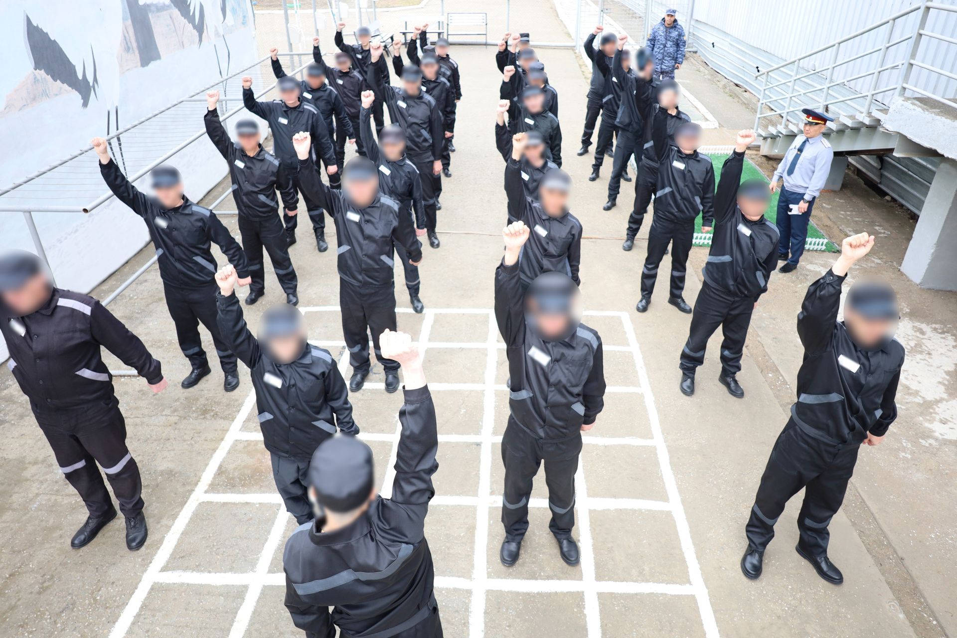 Инструктор из числа осужденных под контролем сотрудника демонстрирует движения, которые остальные повторяют под ритмичную музыку. Это способствует развитию двигательной активности и формированию здорового образа жизни.